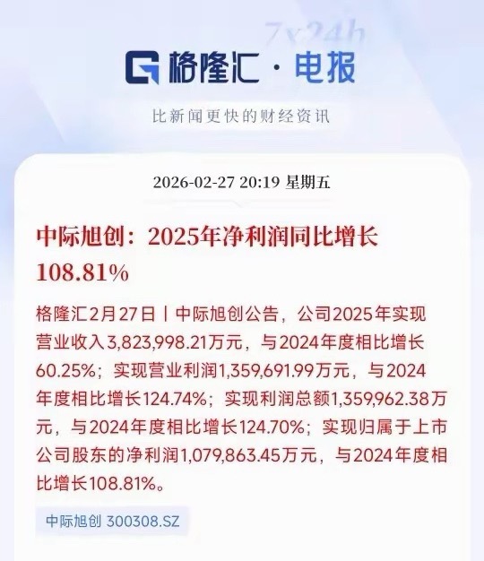 人工智能龙头公布2025年业绩,超预期但股价反而大跌今天2025年最牛个股中际旭创公布了业绩,实现净利润增长108.81%,净利润达到了107亿,机构预期是102亿,完全超出了预期,但是今天中际旭创的股价大跌6.68%,带崩了整个光模块板块,同时也影响了人工智能概念个股。从今天中际旭创的表现看,下跌的主要原因就是英伟达的大跌和利好出尽变成了利空来炒了,这也是A股一贯的作风。目前光模块还是处于紧缺阶段,而且涨价还在继续,所以说2026年的业绩还是很有保障的,预计后期还是会有所表现的。