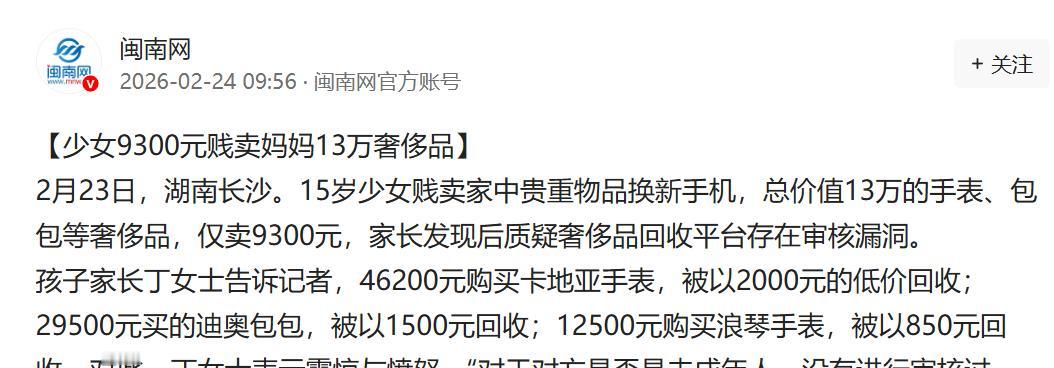 “亏大发了!”近日,湖南长沙,一15岁女孩为了换新手机,竟将妈妈的奢侈品变卖,最终如愿买了手机,但还是被妈妈发现,更气人的是,自己价值13万元的奢侈品,却被平台恶意压价,最终只卖了9300元!网友:太黑心了吧! 事情就发生在近日的湖南长沙,丁女士平时就喜欢收藏奢侈品,那些真皮包袋、剔透首饰,每一件都是她花大价钱淘来的心头好,小心翼翼地收在柜子里,平日里也舍不得轻易拿出来,就像珍藏宝贝一样。她从来没想过,自己精心守护的东西,会被最亲近的人偷偷处理掉。 这天丁女士像往常一样打开柜子,准备整理一下自己的那些奢侈品,可柜子一拉开,她整个人都傻眼了,柜子里空空如也,那些价值13万的宝贝,就像人间蒸发了一样,连个影子都没留下,连一点被翻动的痕迹都没有。 丁女士当时脑子一片空白,第一个念头就是家里进贼了,她赶紧仔细检查家里的门窗,可门窗完好无损,没有任何撬锁、翻动的痕迹,家里的其他东西也都完好,这就让她更加疑惑,到底是谁拿走了自己的奢侈品。 她顺着线索一点点排查,最后所有的疑点,都指向了自己才15岁的亲闺女,这个答案让丁女士既心碎又不敢相信,她怎么也想不通,自己疼爱的女儿,竟然会偷偷卖掉自己的宝贝,而且还是为了一部手机。 原来这个15岁的小姑娘,一直想要一部新款手机,可她不敢跟妈妈开口,怕妈妈不同意,思来想去,就想到了妈妈柜子里的那些奢侈品。她不知道那些东西的真实价值,只觉得看起来很值钱,能换钱买手机,于是就偷偷在网上找了一个二手回收平台,打算把这些奢侈品卖掉。 小姑娘还特意在网上谎报了自己的年龄,又不知道从哪里弄来了一张别人的成年身份证,伪装成了有完全民事行为能力的成年人,像模像样地走完了二手交易的整套流程,等到平台把钱打到她的账户里,她立马就拿着钱,去买了自己心心念念的新手机,全程都没意识到,自己干了一件多离谱、多让妈妈伤心的事。 可最让丁女士崩溃、最让人觉得亏大发的是,自己那些价值13万的奢侈品,最终只卖了9300块钱。13万换9300块,折损率高达百分之九十多,这哪里是正常的二手交易,这简直就是白送,相当于把12万多的钱,白白扔在了水里,想想都让人后脊背发凉。 丁女士发现真相后,又气又心疼,第一时间就联系了那个二手回收平台,要求退货退款,希望能把自己的奢侈品拿回来,可平台那边的态度,却让她气得浑身发抖,平台的工作人员理直气壮地表示,他们已经核验过相关证件,交易流程完全合规,根本不知道交易的人不是成年人,拒绝了丁女士的要求。 这话听起来滴水不漏,可仔细一想全是漏洞,一个明显稚嫩的小姑娘,拿着一堆价值不菲的奢侈品去回收,那些平台所谓的专业鉴定师,不可能看不出这些包包首饰的真实市场价,更不可能看不出小姑娘的年龄有问题。他们之所以把价格压到连一成都不到,根本不是因为“合规”,而是被巨大的利润诱惑,故意恶意压价。 说白了在高额利润面前,平台所谓的审核义务、交易公平,早就被抛到了脑后,只要有一张身份证作为“合规”的遮羞布,他们就敢肆无忌惮地收割,完全不管交易是否合理,不管卖家是不是真的了解物品价值,说白了就是趁火打劫。 这件事传到网上后,网友们的反应出奇一致,纷纷吐槽这个二手平台太黑心,有人说这根本不是正经的二手交易,就是专门针对法律盲区、针对不懂行的人进行的精准收割;也有人说,13万的东西收9300,这平台的良心简直不会痛;还有人感慨,就算证件是真的,这个价格也离谱到不行,明摆着欺负人不懂行。 这场13万跌落到9300的交易,没有一个赢家,小姑娘透支了家人的信任,做错了事情,以后可能需要很长时间,才能修复和妈妈之间的关系,二手平台透支了基本的商业伦理,靠着恶意压价、敷衍审核赚取黑心钱,迟早要为自己的行为付出代价,而丁女士不仅损失了13万的财产,还体会到了被亲闺女背叛的心酸,相当于交了一笔极其昂贵的“家庭教育学费”。 丁女士这13万的损失,真的是亏大发了,不仅亏了钱还伤了心,那部9300块的新手机,屏幕再光亮、功能再诱人,也掩盖不了背后13万的巨大亏空,也掩盖不了家庭教育和平台监管的漏洞,而这场因为一部手机引发的悲剧,留下的裂痕,恐怕要很长很长时间,才能慢慢愈合。