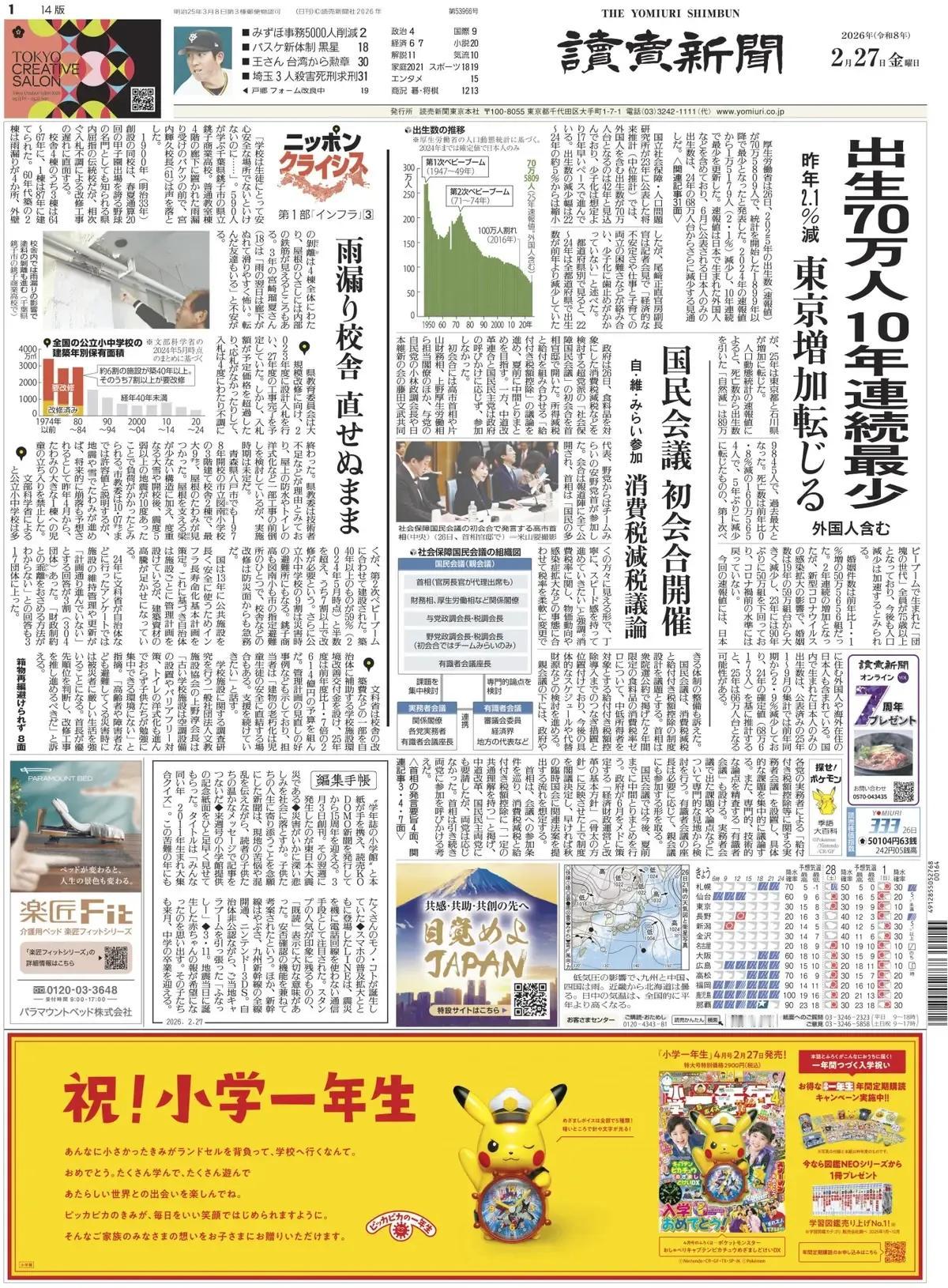 如果出生率无法超过死亡率,日本最终将不复存在。 《读卖新闻》头版报道称,厚生劳动省26日发布消息称,2025年的出生人数(初步统计)为705,809人,是自1899年开始统计以来的最少人数。较2024年的初步统计减少了15,179人(2.1%),实现了连续10年刷新最少记录。初步统计包括在日本出生的外国人等,而将在6月公布的仅限日本人的出生人数,预计将比2024年的68万余人进一步减少。 根据国立社会保障・人口问题研究所于2023年公布的未来推算(中位推算),含外国人在内的出生人数在70万人台被预测将出现在2042年,这表明少子化的速度比预期快了17年。虽然出生人数减少的幅度较2022~2024年的约5%有所缩小,但官房副长官尾崎正直在记者会上表示,“经济的不稳定性以及工作与育儿兼顾的困难等因素交织在一起,导致少子化问题没有得到遏制”。 按都道府县来看,2022~2024年所有都道府县的出生人数均比前一年下降,但2025年东京和石川县的出生人数出现了回升。 根据人口动态统计的初步数据,死亡人数减去出生人数的“自然减少”达到899,845人,创历史新高。死亡人数为1,605,654人,比上年减少0.8%,是时隔5年首次下降,但第一代婴儿潮出生的人群“团块世代”均已超过75岁,预计未来人口减少将加速。 婚姻数为505,656对,比上年增加1.1%。连续两年增长,但由于新冠病毒疫情的影响,婚姻数较2019年的约59万对大幅减少,到2023年首次跌破50万对,创下90年来的新低,尚未恢复到疫情前的水平。 此次的初步数据显示,包括居住在日本的外国人以及海外居住的日本人在内。仅在国内出生的日本人数,根据已公布的25年1月至9月的统计数据,同比减少了2.9%。以24年的最终数据(686,173人)为基准推算,25年可能为66万人左右。 据厚生劳动省公布的2025年人口动态统计(初步值),大阪府的死亡人数超过出生人数的“自然减少”达到历史最高。结婚人数连续第二年增加。 死亡人数为11万492人,与去年持平。出生人数(5万5111人)比死亡人数少5万5381人,“自然减少”是自2010年开始发布快报以来的最大值。 婚姻数量比上年增加3.3%(1367件),达4万2250件,实现了连续两年的增长。虽然尚未达到疫情前的2019年水平(4万7638件),但呈现出回升趋势。 府政府分析认为少子化的原因在于“三道障碍”——“结婚的障碍”、“第一胎的障碍”、“第二胎的障碍”。府政府计划除与民间团体合作进行结婚支援外,还将重点支持双职工家庭的相关服务。对于出生人数的减少,大阪府知事吉村洋文在26日对记者表示:“在发达国家少子化不可避免,但采取可行措施并缓和下降趋势非常重要。” 大阪市的出生人数比上年持平,为1万8295人。市政府计划从今年9月起,将0~2岁婴幼儿的托育费用减免扩大到第一个孩子,并在新财年的初步预算案中列支相关费用244亿日元。