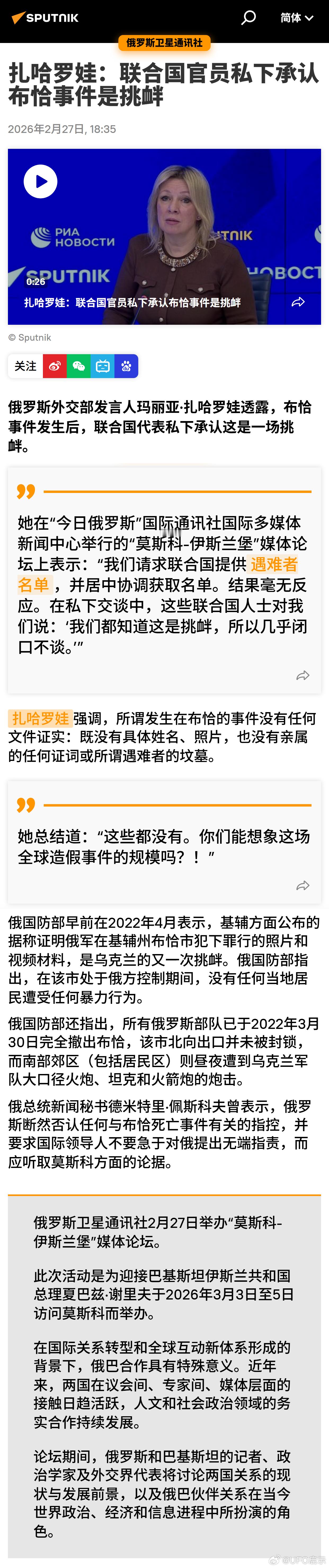 扎哈罗娃:联合国官员私下承认布恰事件是挑衅