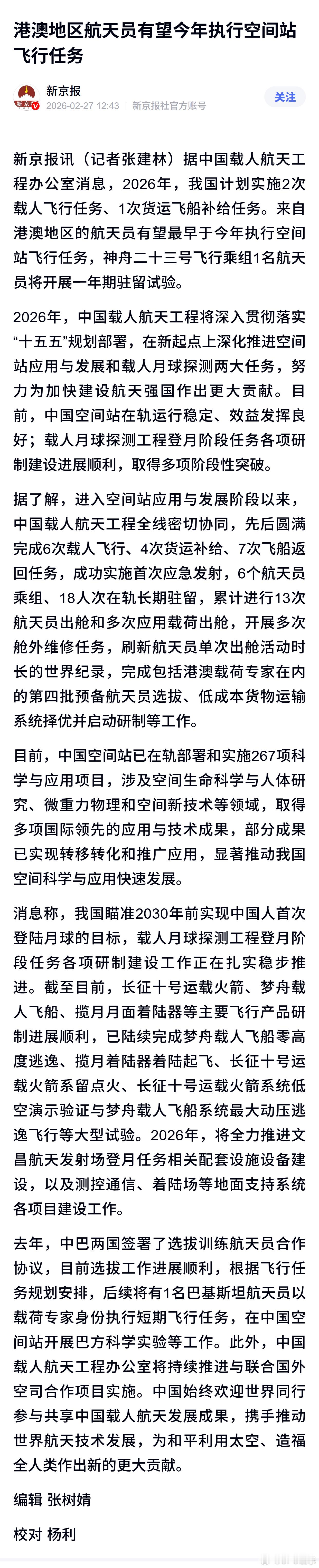 港澳地区航天员有望今年执行空间站飞行任务