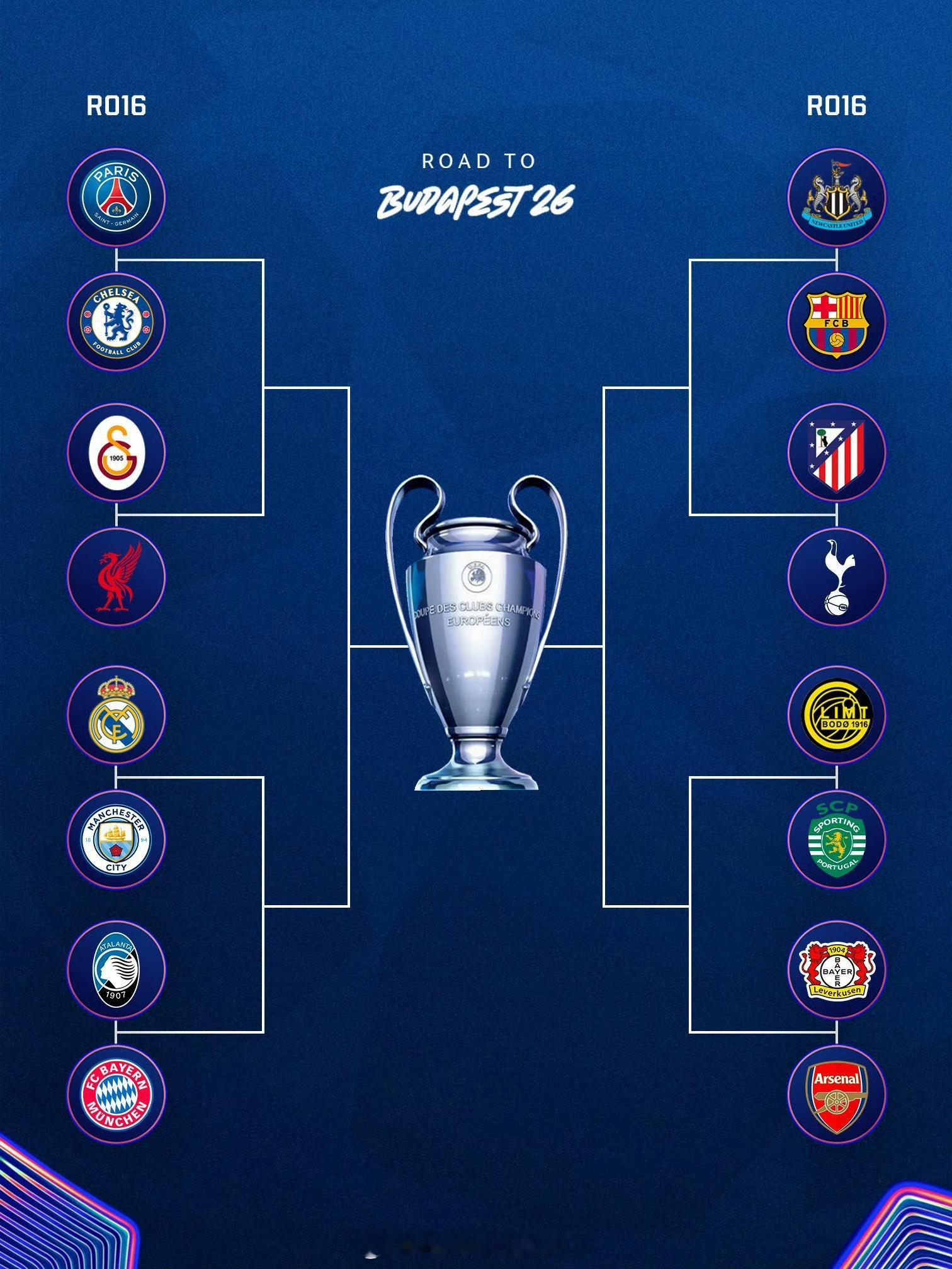 欧冠抽签仪式结束,皇马、曼城、大巴黎、拜仁、利物浦组成死亡上半区,阿森纳、巴萨、马竞则在下半区等待对手。欧冠淘汰赛对阵上半区:巴黎 vs 切尔西加拉塔萨雷 vs 利物浦皇马 vs 曼城亚特兰大 vs 拜仁下半区:纽卡 vs 巴萨马竞 vs 热刺博德闪耀 vs 葡体勒沃库森 vs 阿森纳