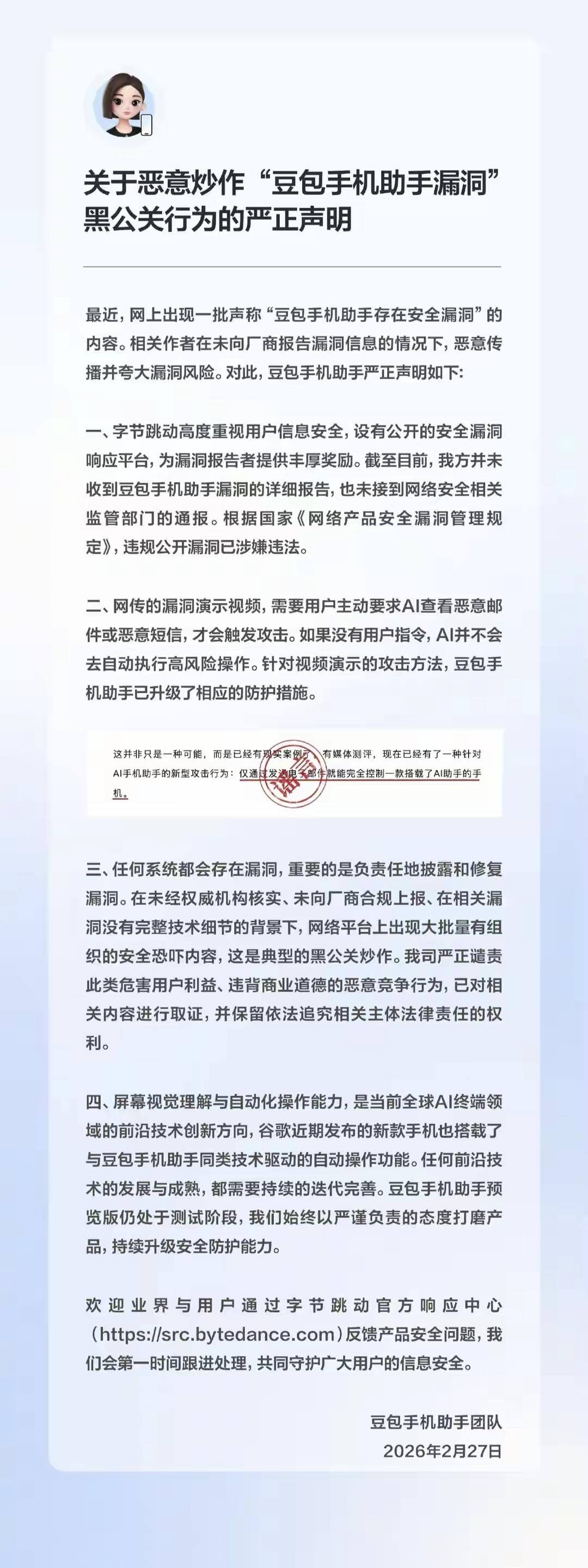 字节跳动今天直接把“豆包手机助手漏洞”事件定性为恶意炒作的黑公关,这波回应,信息量比漏洞本身还大。 首先要说,漏洞是真的,但攻击是“演”的。 声明里最关键的一句话:“需要用户主动要求AI查看恶意邮件或恶意短信,才会触发攻击。”也就是说,所谓“远程控制手机”的前提,是你得亲手把AI往火坑里推。没有用户指令,AI根本不会自动执行高风险操作。这就像你把家门钥匙递给骗子,然后说“门锁有漏洞”,逻辑上站得住脚吗? 其次,没上报就曝光,涉嫌违法。 字节明确指出:“截至目前,我方并未收到豆包手机助手漏洞的详细报告,也未接到网络安全相关监管部门的通报。” 根据《网络产品安全漏洞管理规定》,未经上报就公开漏洞细节,本身就涉嫌违法。这波操作,更像是“先捅刀子,再喊救命”,目的不是修复漏洞,而是制造恐慌。 另外,黑公关的套路,太眼熟了。 声明里直接点名:“在未经权威机构核实、未向厂商合规上报、在相关漏洞没有完整技术细节的背景下,网络平台上出现大批量有组织的安全恐吓内容,这是典型的黑公关炒作。”有组织、有节奏、有话术,甚至连“仅通过发送电子邮件就能完全控制手机”这种夸张表述都用上了。 这哪里是技术讨论,分明是一场精心策划的舆论围剿。 AI时代的安全焦虑,被人当枪使了。 豆包手机助手还在预览版测试阶段,屏幕视觉理解与自动化操作是前沿技术,谷歌的新款手机也搭载了同类功能。 任何新技术的成熟都需要迭代,但有人却把“测试阶段”当成了攻击的靶子,把用户的安全焦虑变成了收割流量的工具。 最后想说的是,当“安全漏洞”变成了商业竞争的武器,当“技术问题”变成了舆论战的弹药,最终受伤的,永远是普通用户。字节已经取证,并保留追究法律责任的权利。这不仅是为了自己,更是为了整个行业的底线。 你觉得这波黑公关,背后是谁在操盘?评论区聊聊你的看法👇 豆包手机助手 黑公关 AI安全 字节跳动