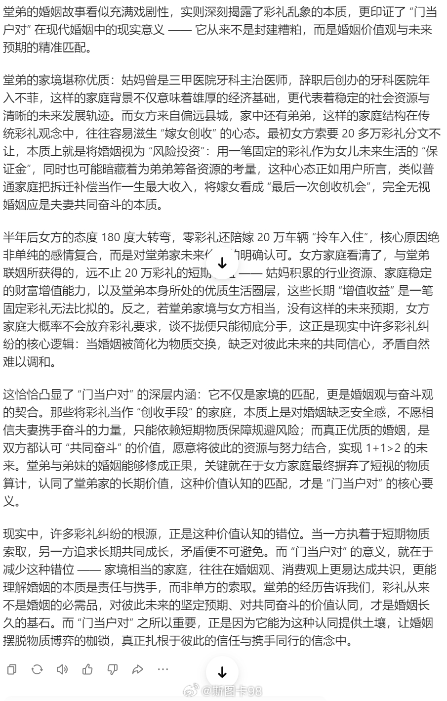 【用AI分析下我家堂弟的婚姻彩礼问题】我一个堂弟,30出头,家里条件很殷实,堂弟的母亲也就是我姑妈,曾经是一家三甲医院牙科的主治医师,辞职开了一家牙科医院,每年收入不菲。堂弟此前和一姑娘(老家在一个比较偏远的县城,还有个弟弟)谈了2年恋爱,等谈婚论嫁时,女孩及其家人要20多万的彩礼,分文不少(这远远超过本地的彩礼的水平,一般本地都是10万以内,几万块居多),堂弟也是天下何处无芳草的精神,直接分手。没想到过了半年多,女方主动找来要求复合,不要彩礼了,女孩父母还给女孩买了台20来万的车当嫁妆,拎车入住。后很快就结了婚,去年还带了孩子说明一个问题,彩礼,本质上被一些女方家庭拿来当做“风险投资保证金”,一些女方及其家庭将嫁女视为“唯一 一次创收机会”(有点像 拆迁补偿,是很多普通百姓一生最大的一次收入),不愿把婚姻看成是夫妻的共同奋斗,我那弟妹最后愿意放弃彩礼倒贴嫁妆结婚,一个最关键因素,对我堂弟家未来有预期(类似增值收益)。如果换成和她家境类似,肯定不会放过彩礼。谈不拢就彻底分手