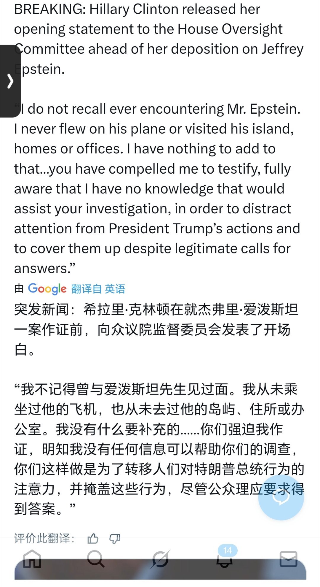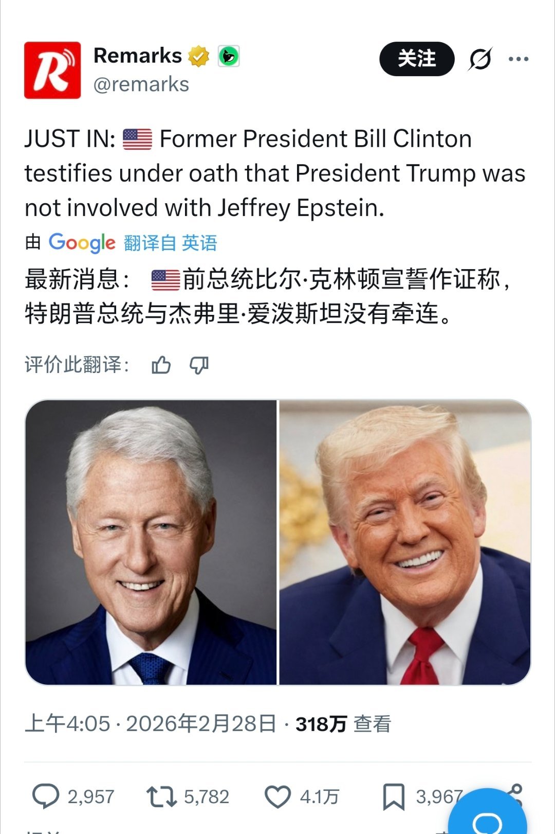 希拉里:我认为特朗普和爱泼斯坦有关 克林顿:我认为特朗普和爱泼斯坦无关