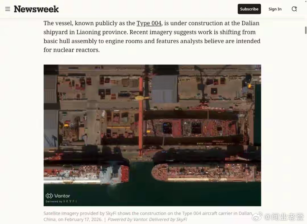三班倒昼夜施工的灯火下,一艘被外界高度关注的巨舰正在加速成形。美国《新闻周刊》援引卫星照片与专家解读称,中国正在建造的第四艘航母——004型——“极有可能”采用核动力系统。这一判断来自前美海军潜艇军官汤姆·舒加特,他根据2月17日的卫星照片指出,船体内部出现两个疑似带屏蔽结构的反应堆舱位,以及多达四个轮机舱布局,与美军福特级早期建造阶段存在相似之处。