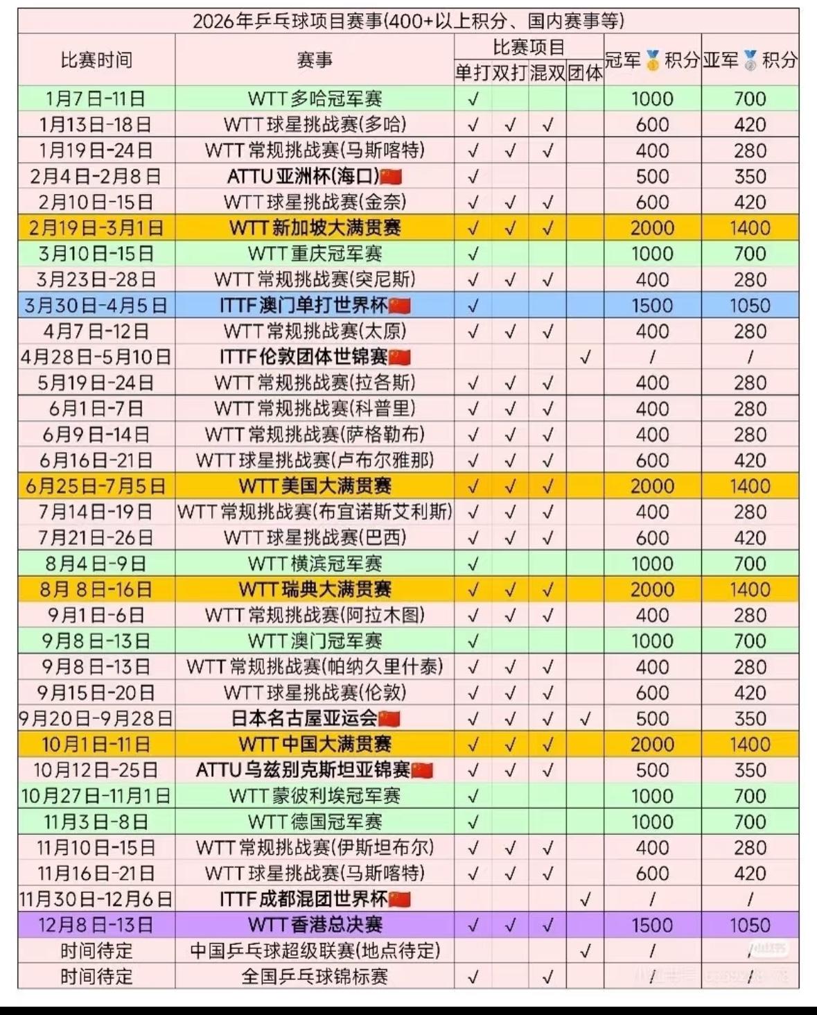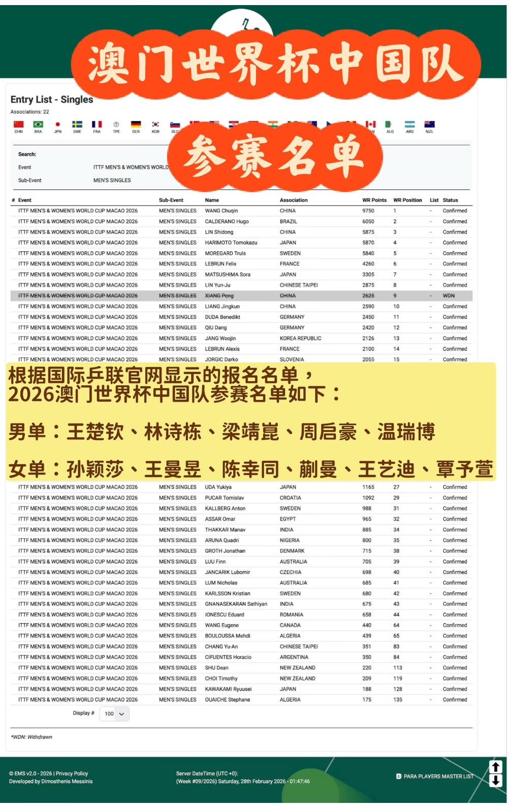 国际乒联官网2026澳门世界杯中国队参赛名单: 男单:王楚钦 林诗栋 梁靖崑 周启豪 温瑞博 女单:孙颖莎 王曼昱 陈幸同 蒯曼 ,王艺迪 覃予宣 澳门单打世界杯是在3月30日—— 4月5日举行, 新加坡大满贯即将进入尾声, 接下来就是3月10日—15日的 重庆冠军赛, 3月23日至28日还有一站 WTT常规挑战赛突尼斯站, 常规挑战赛估计国乒主力队员 不会报名参加, 重庆冠军赛后,国乒主力阵容将 全力备战半个月后的澳门世界杯, 世界杯的参赛名单已公布, 乒协会不会还有调整, 我们拭目以待吧!