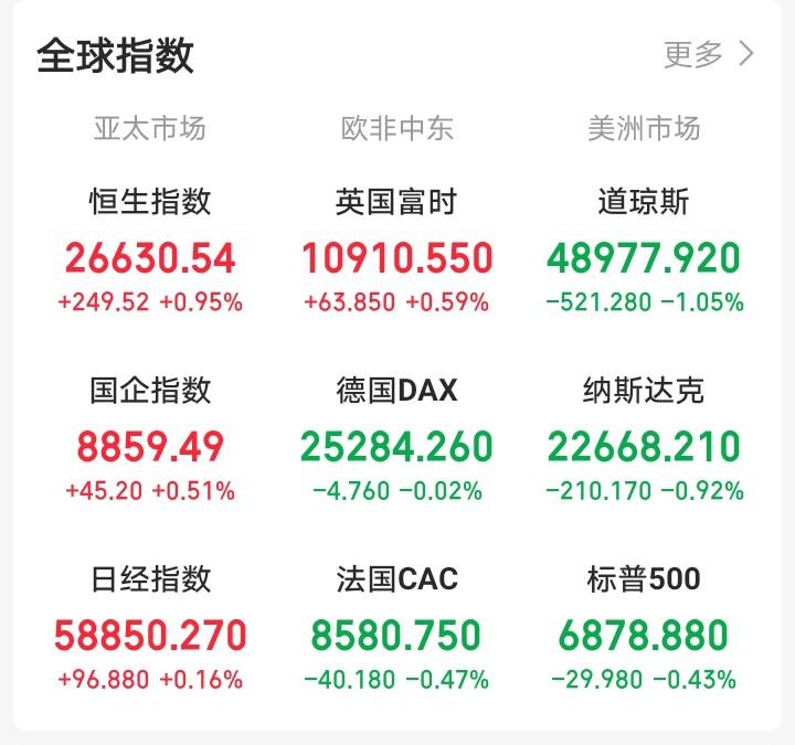 昨天晚上还想着A股周五抗住了外围压力没有大跌,下周一大A还会反人性上涨! 一觉醒来,顿感不妙!中东局势升温,老美三大指数集体收绿,中概股多数下跌。富时中国三倍做多ETF下跌,纳斯达克中国金龙指数收跌,富时A50期指连续指数也收跌,氛围不算融洽!给大A下周一走势蒙上了一层阴影,下周一大A收红压力不小! 隔夜,道指下跌1.05%,纳指收跌0.92%,标普500收跌0.43%,富时中国三倍做多ETF下跌0.84%,富时中国三倍做空ETF上涨0.87%,富时A50期指连续指数下跌0.31%,纳斯达克中国金龙指数下跌1.81%,总体来看,氛围不算融洽!下周一大A有点悬! 至于美股三大指数下跌的原因媒体解读为:是受人工智能(AI)泡沫担忧情绪加剧及美国通胀数据超预期的双重影响,老美科技股和金融板块集体下跌。 从A股日K线运行情况来看,走势还是比较强势,上证指数和深成指运行在五日线上,创业板延五日线震荡。成交量维持在20000亿上方,量能充沛,板块方面涨价概念走势强劲。当前看大A指数走势没有什么问题,或许再次扛住,外盘普跌的影响,也未可知! 就算没有抗住,也是没办法的事,买了的要放宽心态,平常心对待,不能输了钱,还输心情!空仓的就不用说了,肯定是希望跌的越多越好! 不管怎么样,他们跌就跌吧,市场不可能一直涨,也不可能一直跌,放宽心态,先安心过周末! 人最重要的是,要保持积极良好的心态,积极乐观的过好每一天。心有光,脚下有路,你远比自己想象的更坚韧,追光的人,终会光芒万丈。 理财有风险,投资需谨慎。大家一定要保持谨慎,做好风险控制。 点赞,关注是对我最大的支持!