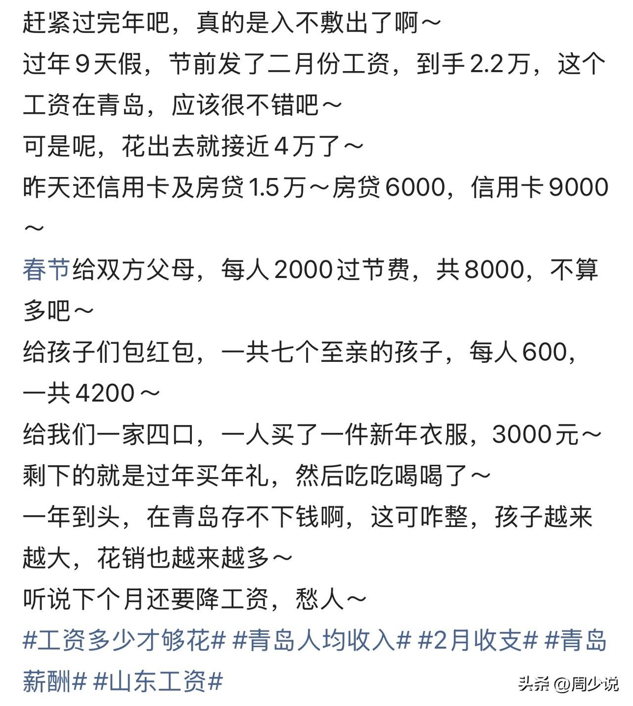 “太真实了!”月薪到手2.2万,在青岛算得上高薪了,可这位网友却发文直呼:“寒假过完年,快撑不住了!” 春节9天假期,他二月工资到手2.2万,可前后花销直逼4万,直接入不敷出。房贷6000加信用卡9000,一还就是1.5万;给双方四位父母各2000元,共8000;七个孩子红包4200,一家四口新衣3000,再加上年货、聚餐,钱转眼就没了。更让他焦虑的是,听说下个月工资还要降,花销只增不减,一年到头根本存不下钱。 这番吐槽引发了网友的强烈共鸣,有网友说:“太真实了,看似工资不低,实则被各种开销掏空,过年就是大型花钱现场”。 也有网友感慨:“在二线城市生活,房贷、养娃、养老,哪一样都压得人喘不过气”。 在周少看来,可以说这位小伙的经历,正是当下不少城市中产的真实写照。看似可观的月薪,在房贷、赡养老人、养育子女、人情往来等多重压力下,瞬间变得捉襟见肘。过年的消费支出,不过是日常经济压力的集中爆发而已。 其实在一二线周边城市,这样的情况并不少见。看似不错的收入,被固定开支、人情往来拆得七零八落,再加上孩子成长的开销,想存下钱确实难上加难。 当然,过年的花销只是生活压力的一个缩影,这也给所有人提醒,想要改变这种入不敷出的状态,提前做好收支规划,才能让日子少点焦虑。 毕竟收入难免有波动,把钱花在刀刃上,才能在生活里多留几分底气。#寻美三湘# #周少说教育#