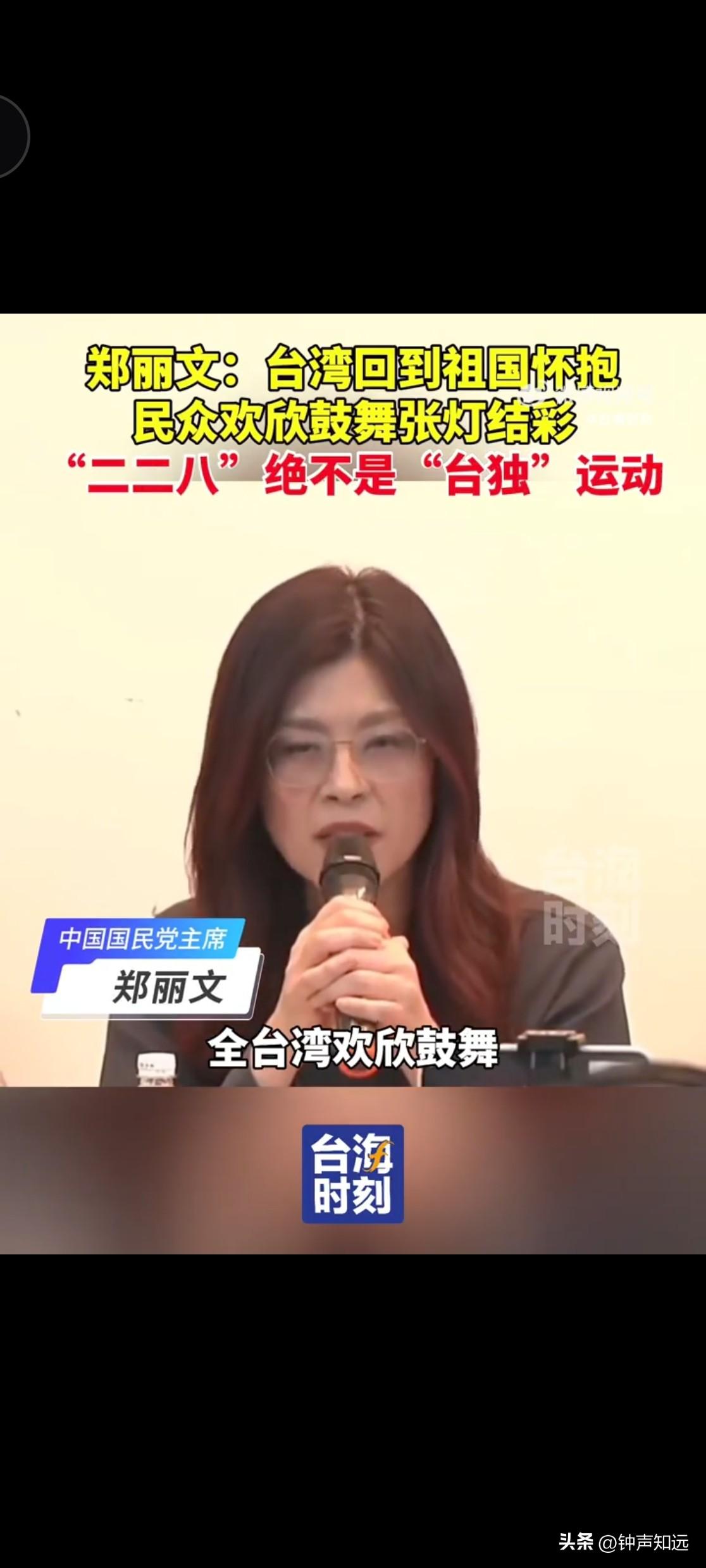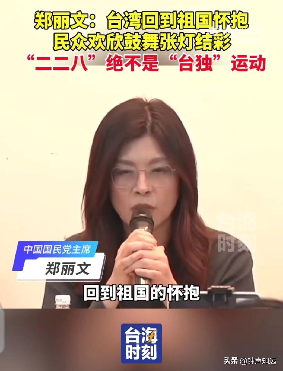 郑丽文228喊话台湾回到祖国怀抱欢欣鼓舞,台独纷纷绿转红,赖清德也改口了。 228纪念座谈会上郑丽文的讲话戳破了台独多年的谎言。她明确说,1945年台湾光复是回到祖国怀抱,全台欢天喜地、张灯结彩,1947年的228事件,是民众争民主、反不公的抗争,和台独一点关系都没有,后来被人断章取义、篡改挪用,完全违背历史事实,必须还原真相。 最近台湾一连串信号,说明统一是人心所向、大势所趋。 一贯强硬的赖清德,最近在台商活动上罕见改口,多次用大陆、中国大陆,不再搞对立话术,明显是扛不住民意与现实压力。 台北101董事长贾永婕,春节直言我是中国人,过年就要穿大红,讲出台湾民众最朴素的家国认同。 深绿名嘴彭文正更是直接表态台湾人就是中国人,从血缘、历史、文化到法理,都改不了,谁也别想数典忘祖。 从政治人物到企业负责人,再到媒体人,越来越多人看清台湾是中国不可分割的一部分,历史不容篡改,台独没有出路。 真相归位,人心归宗,两岸统一的大势,谁也逆转不了! 郑丽文228讲话