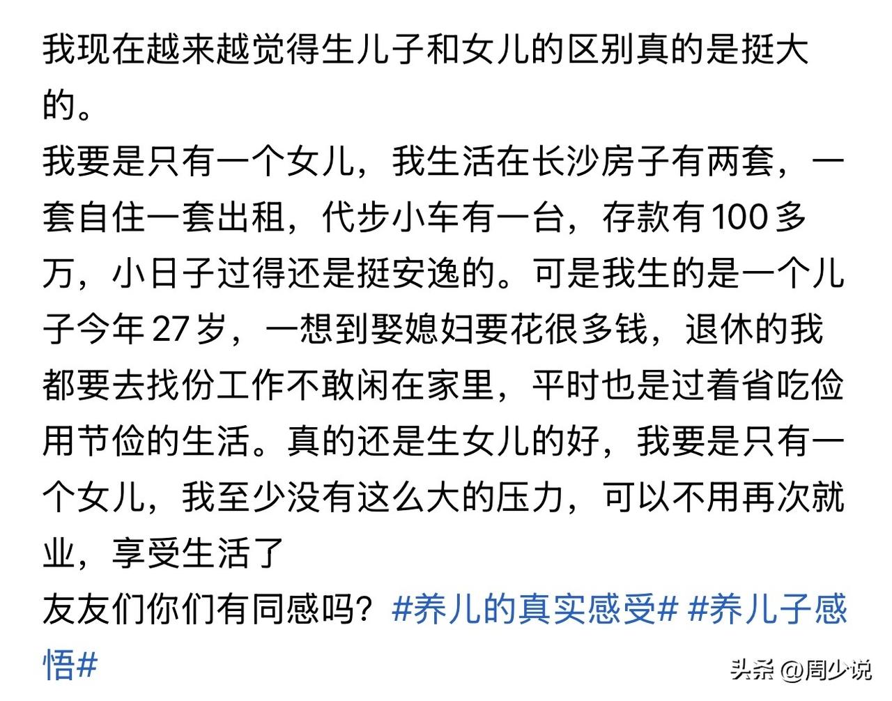 “太戳人心了!”湖南长沙,一位退休阿姨的吐槽,瞬间引发热议。这位退休阿姨家境本不错:长沙两套房,一套自住一套收租,有车还有百万存款,本该安享晚年。可偏偏儿子27岁到了成家年纪,彩礼、婚房、婚礼样样都是大开销,逼得她不得不重新出门找工作,平日里省吃俭用,一点不敢松懈。她忍不住感慨:“要是生的是女儿,现在早就舒舒服服过日子了,哪用得着这么累”。 这番话,很快引来网友热议。有人说:“太真实了,生儿子就像背负了一座山,一辈子都在为孩子打拼”。 也有人觉得:“儿女都一样,只是当下结婚成本太高,父母压力都不小”。 其实在周少看来,这位退休阿姨的心酸,从来不是嫌弃儿子,而是当下普通家庭最真实的无奈。不是生儿生女有天壤之别,而是居高不下的结婚成本,压得父母们喘不过气。 很多父母辛苦一辈子,攒下的家底,本想用来安度晚年,可到了孩子成家时,还是不得不掏出来补贴。我们总说养儿防老,可不少父母,到老了还在为孩子的未来奔波。 当然,生儿生女从来不是决定幸福的关键,真正能让父母轻松的,是孩子独立懂事,是社会能给普通家庭多一点包容。 父母的爱从来不分性别,只希望每一份付出,都能被理解,每一对辛苦的父母,都能安安稳稳,过上自己想要的生活。 对于这位长沙退休阿姨的吐槽,大家觉得生儿生女区别真这么大吗?#寻美三湘# #周少说教育#