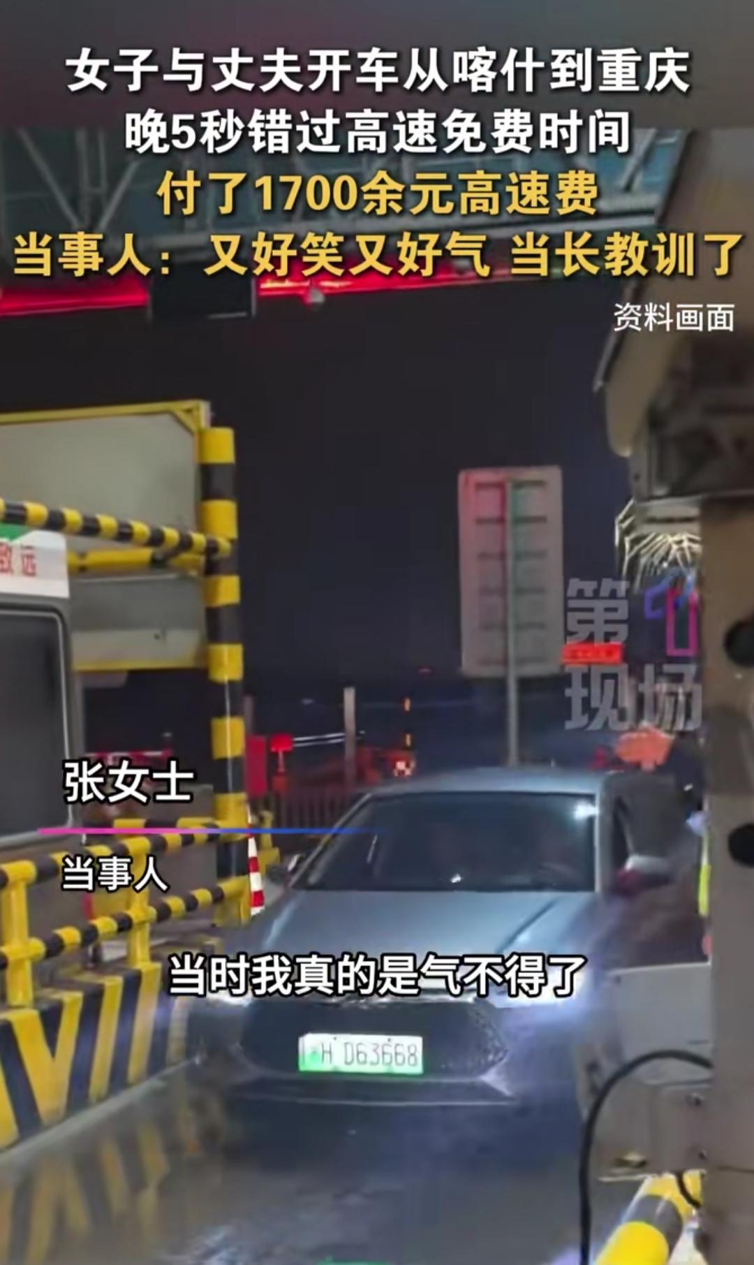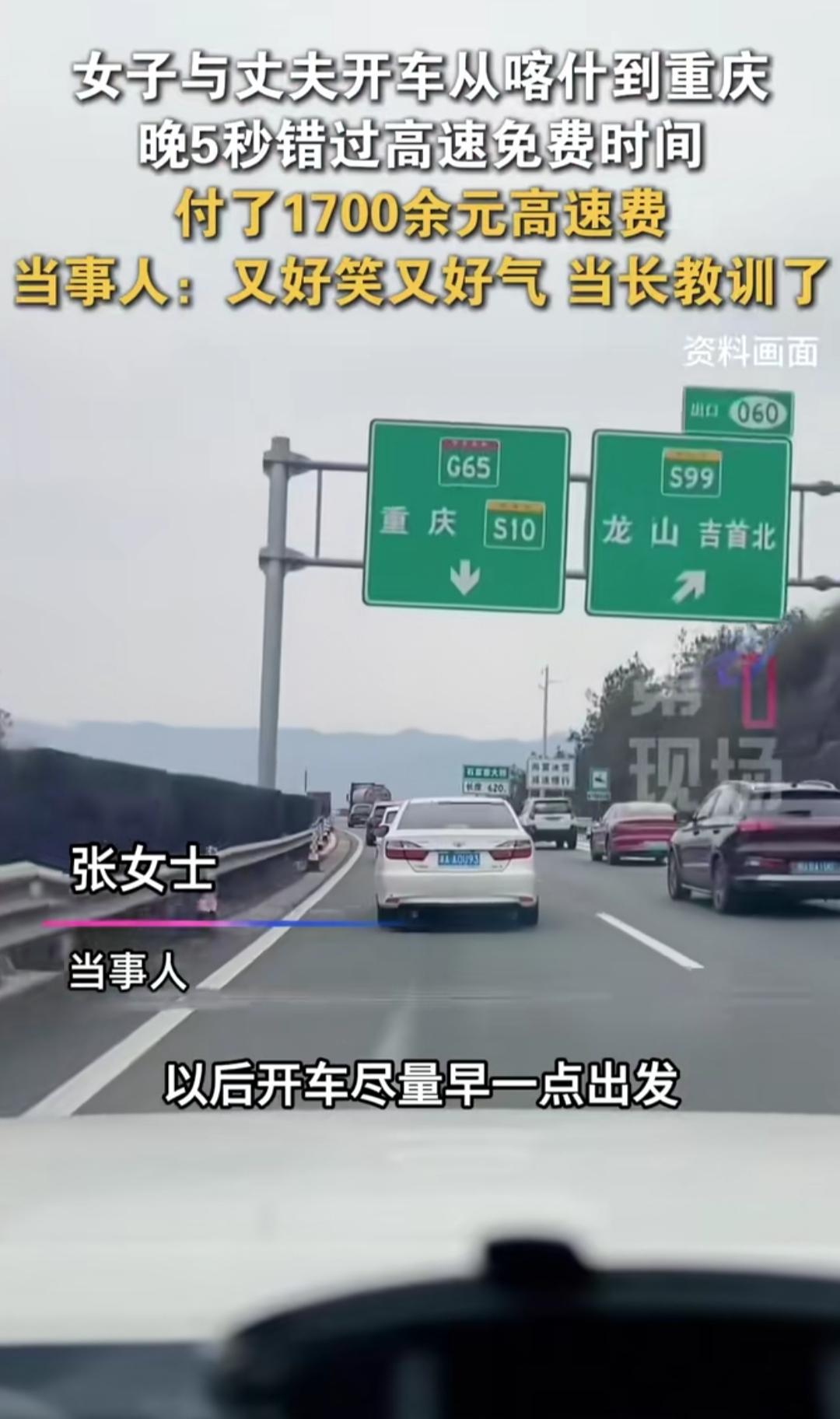春节返程的糟心瞬间真的能记一辈子!一对夫妻开车返程,一路紧赶慢赶就想卡着高速免费的点下站,结果偏偏差了短短5秒,就这一眨眼的功夫,直接与免费擦肩而过,属实让人心里堵得慌。 本以为只是小差几秒,顶多补点费用,没想到高速计费系统精准到秒,晚了这5秒,就要按全程收费,一下掏出1700元高速费,任谁遇上这事,估计都得愣半天,心疼又无奈,返程的喜悦瞬间被浇灭。 其实这事儿也让不少跑高速的朋友感同身受,高速免费以出口时间为准,系统铁面无私不松口,人工也没权限更改。出门在外,赶时间的同时也得顾着安全,只是这5秒换1700元,想想还是觉得太戳心了。