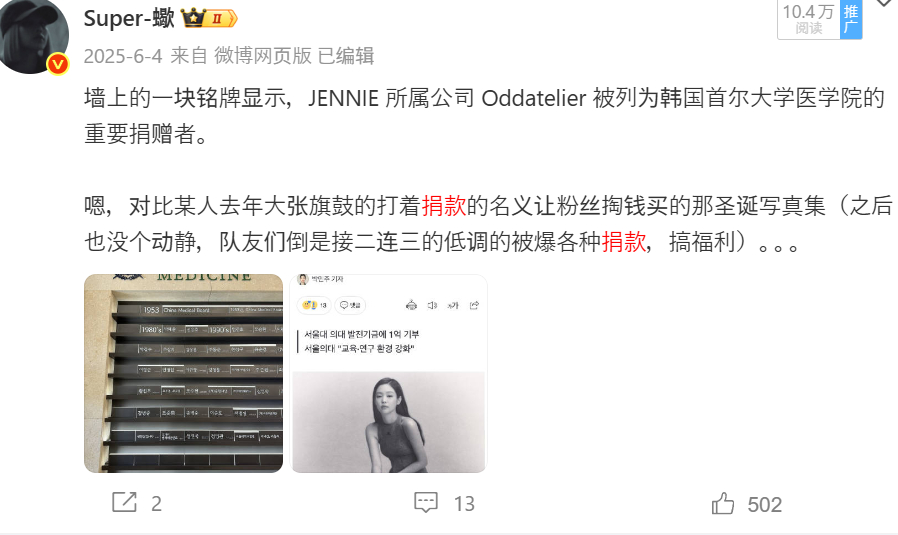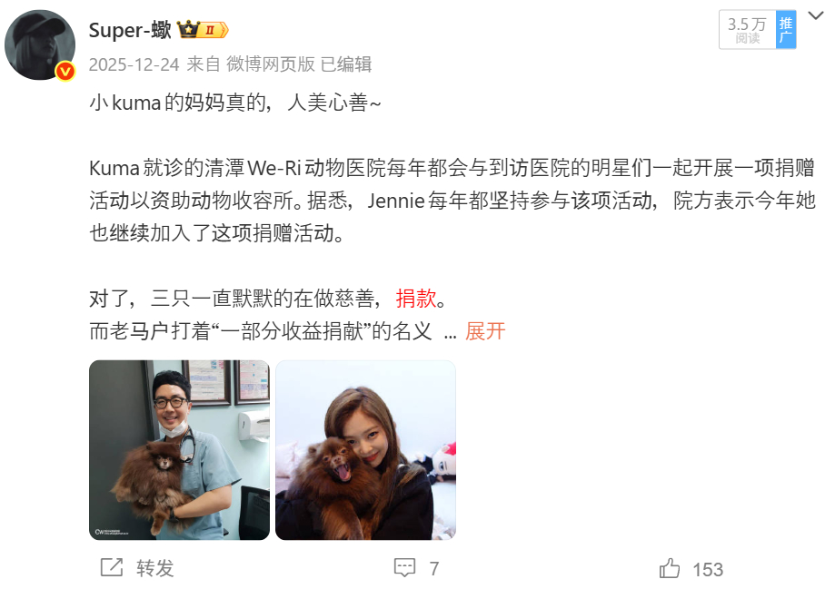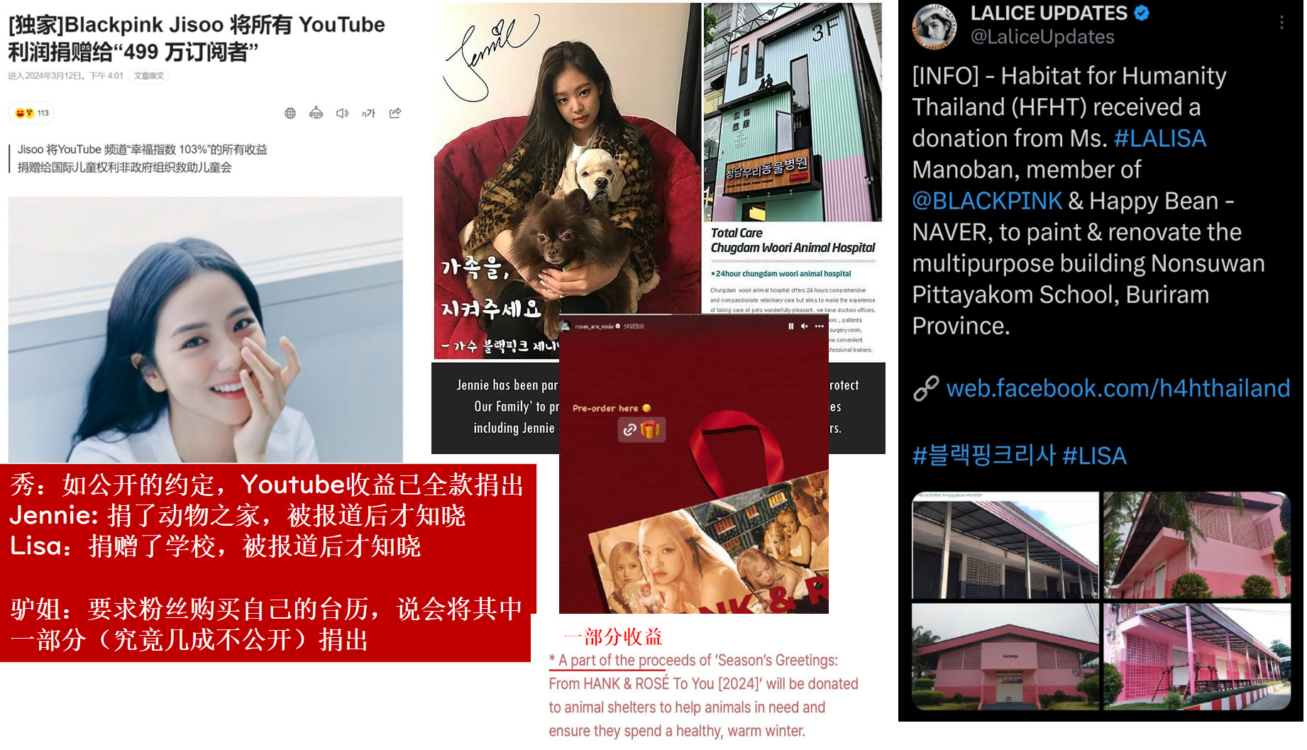 三只基本都有一个共同点,就是,基本都是默默捐赠,然后是被捐款方或者相关人士报道才知道,基本自己没有出镜吹嘘,作过任何秀。【秀秀】默默捐赠1亿韩元,捐赠偏远地区学校,官方油管全额捐赠,等等【妮妮】韩国首尔大学医学院的重要捐赠者,清潭We-Ri动物医院慈善捐赠者,等等【小五】一直在默默提供餐食和经济援助,捐赠偏远地区学校,捐赠舞蹈学校,等等