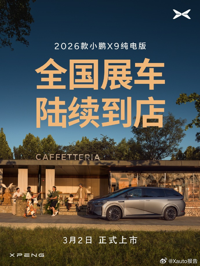 2026款小鹏X9纯电版展车已陆续到店何小鹏官宣2026款小鹏X9纯电版3月2日上市,目前展车已陆续到店,欢迎消费者到店品鉴。何小鹏官宣2026款X9纯电版3月2日上市小鹏x9