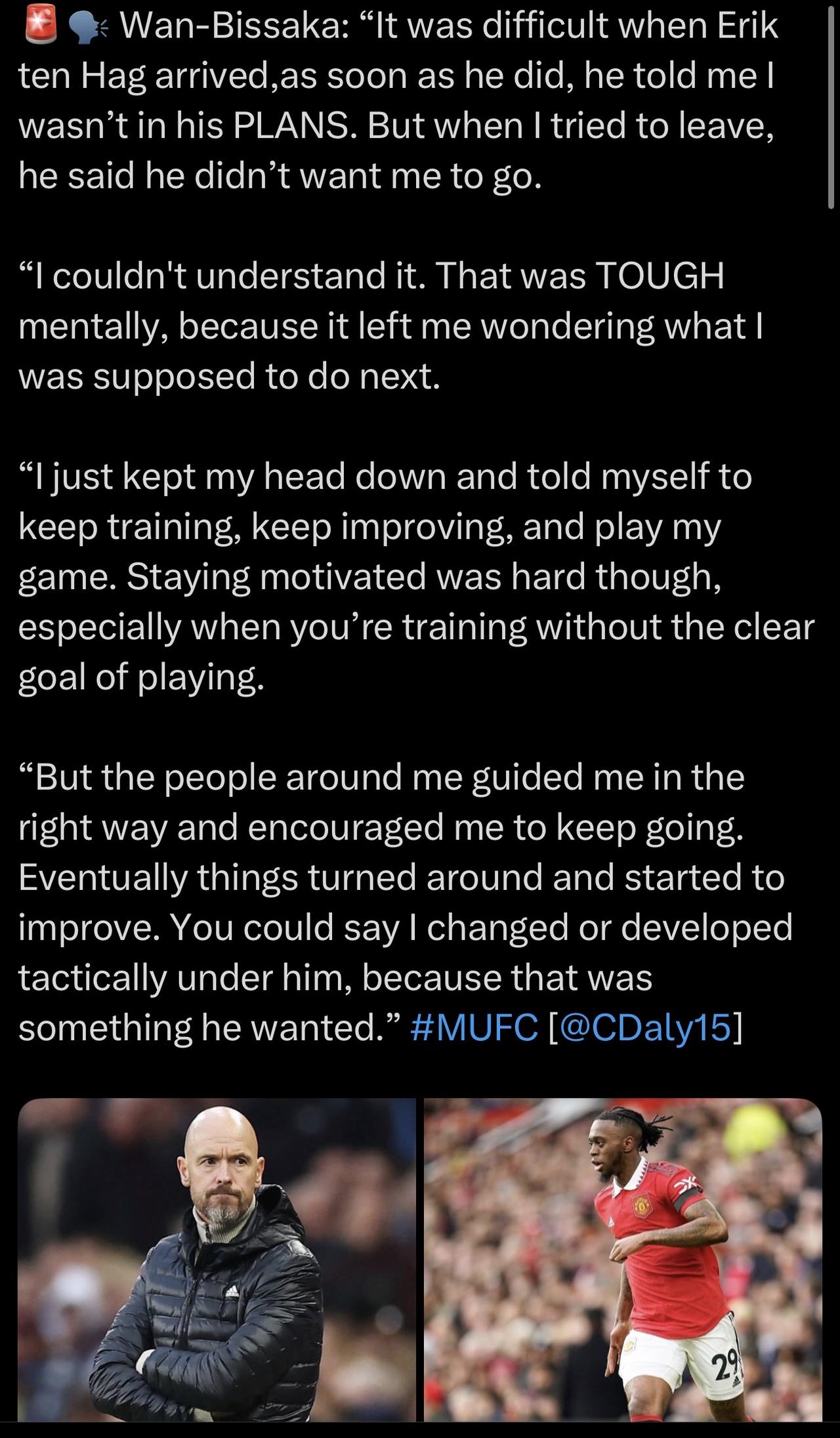 在英超做主教练的光头都是“岳不群”? 阿莫林 这种傻又直的,说不要就不要的犟种,确实不会有好下场。 ……………………………………………………………… 万-比萨卡:“埃里克·滕·哈格到来时,情况很艰难。他一来就告诉我,我不在他的计划之内。但当我试图离开时,他说他不想让我走。” “我当时完全无法理解。那段时间精神上非常难熬,因为我不知道接下来该怎么办。” “我当时就埋头苦练,告诉自己要继续训练,不断进步,好好打球。不过,保持动力真的很难,尤其是在没有明确比赛目标的情况下训练。” “但我身边的人引导我走上了正确的道路,鼓励我坚持下去。最终情况好转,开始好转。可以说,在他的指导下,我的战术水平有所提高,因为这是他所希望的。”