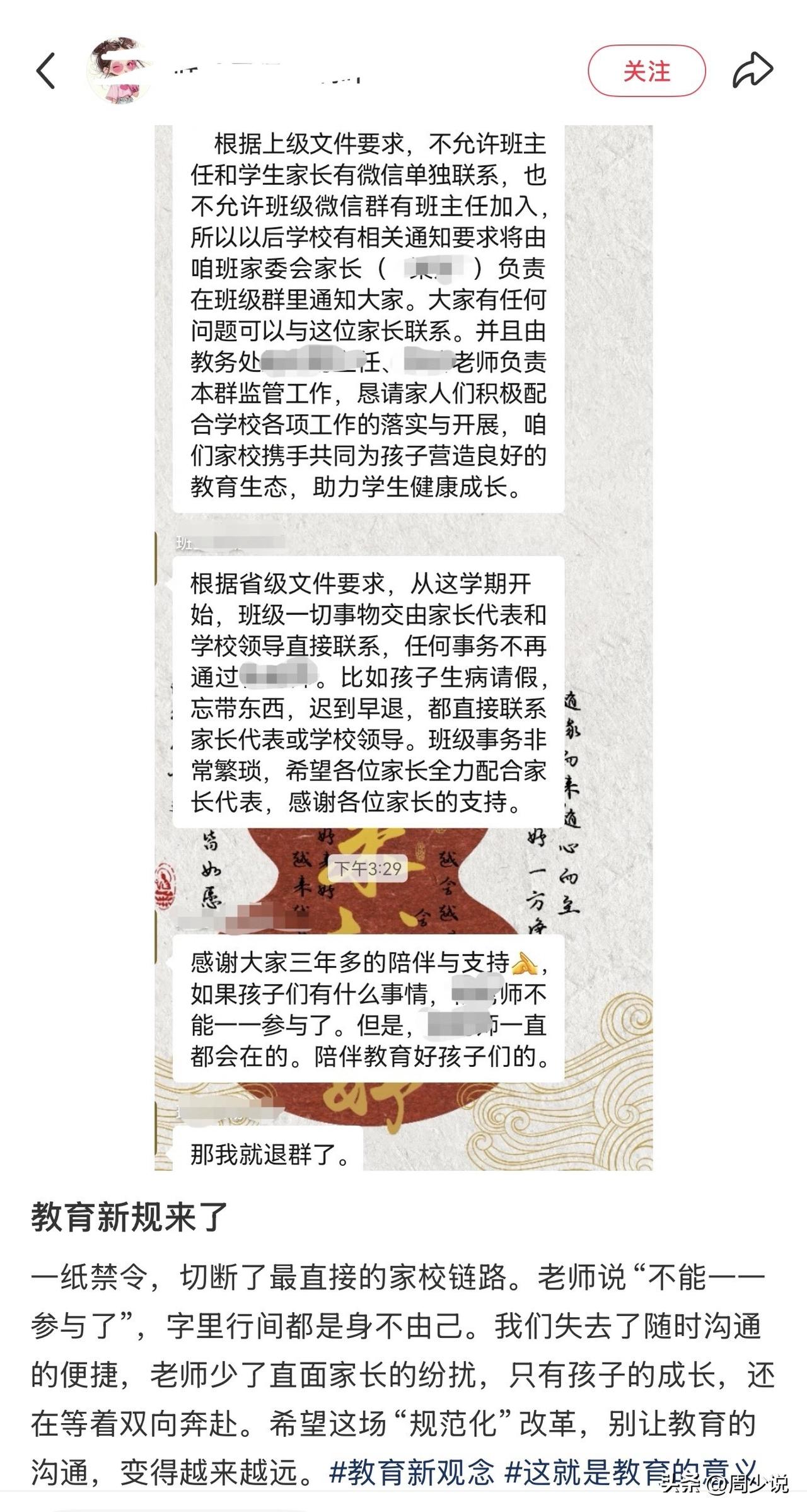 “班主任不得私联家长,也不能进班级微信群?”网友爆料:新学期伊始,学校的一则群通知,直接让家长群炸了锅。群通知明确,今后学校通知由家委会转达,孩子请假、迟到等所有事宜,均需对接家长代表或学校领导,任何事物不再通过班主任。班主任坦言:“如果孩子以后有什么事情,无法一一参与,却始终会在”。 这番调整,让不少家长直呼不适应。有网友吐槽:“孩子在学校有点小事,找班主任最直接,现在绕来绕去,生怕耽误事”。 也有家长表示理解:“班主任琐事太多,或许能让他们更专注教学”。 还有老师无奈感慨:“想及时跟家长说孩子情况,现在却少了最直接的渠道”。 看完这个群通知,周少觉得如果属实,确实让人有些感到难以置信。这项新规的初衷,可能是为了规范家校沟通、给班主任减负。但一刀切的禁令,却硬生生切断了家校间最直接的沟通链路,多少显得有些生硬。 要知道,班主任是最了解孩子在校状态的人,日常的小细节、学习的小波动,这些细碎却重要的信息,未必适合全部经由家委会转达。 一来二去的传话,不仅可能出现信息偏差,还容易让沟通效率大打折扣。家长遇到问题找不到对接人,老师想反馈情况却没渠道,最终受影响的,大概率还是孩子的成长。 客观的说,周少认为家校沟通的核心,从来都不是“禁”与“限”,而是找到更高效、更贴心的方式。规范沟通形式没问题,但不该让必要的交流变得层层阻隔。 真正的家校携手,应该是让老师有精力教学、有渠道沟通,让家长能及时了解、安心托付,而非用一纸禁令,让彼此变成“隔空传话”的陌生人。 教育的双向奔赴,从来都需要畅通的沟通做桥梁,这一点,值得相关部门再细细斟酌。#寻美三湘# #周少说教育#