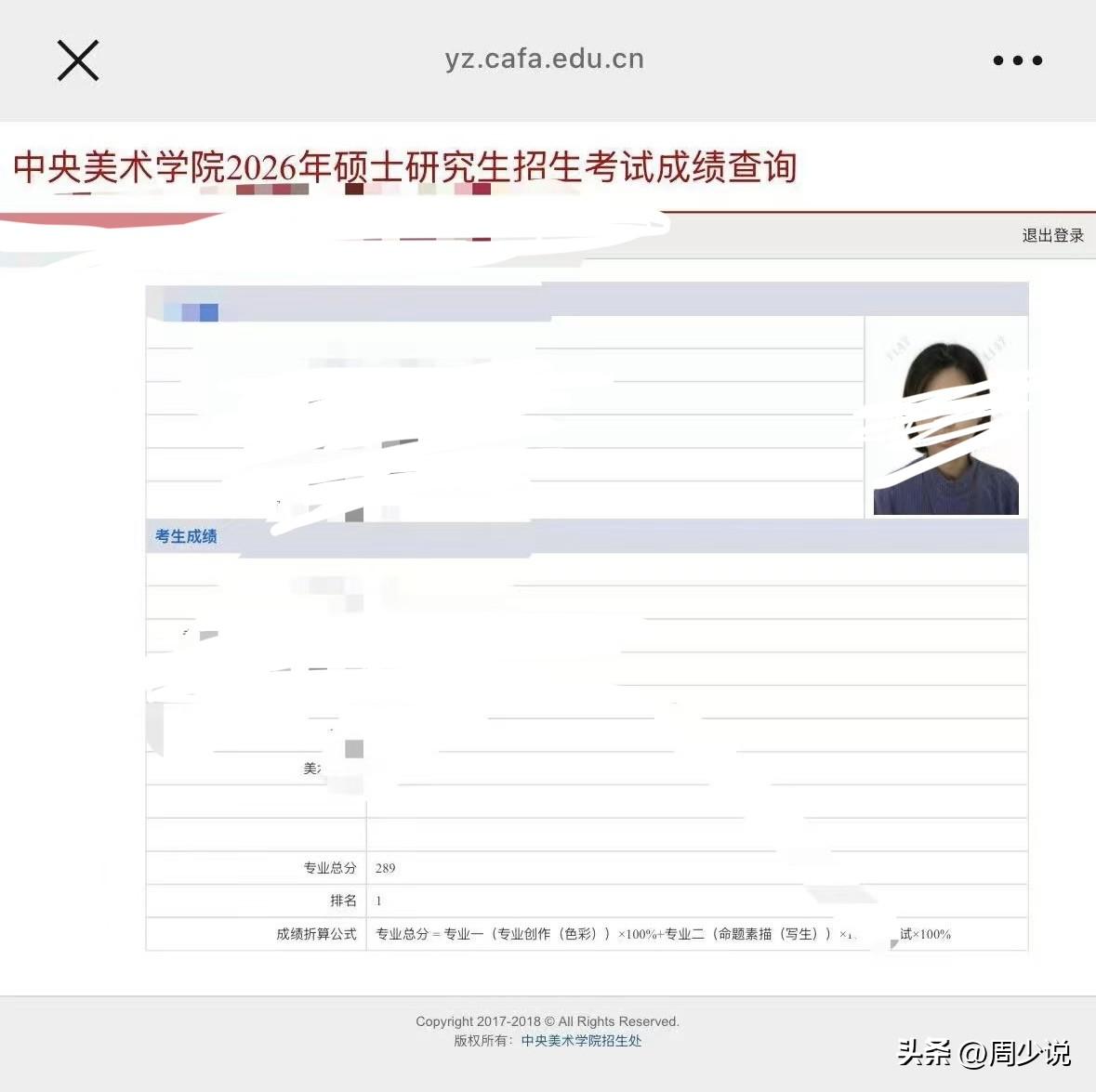 #考研今起陆续出分#“太牛了!”朋友的女儿考中央美术学院研究生,查完成绩直接惊艳,专业总分289分,拿下全国排名第一的好成绩!不得不说,日复一日的画笔耕耘,终换来了这份耀眼的收获,妥妥的实力派,按照这个情况,大概率是考上了,真替她感到高兴,将来前途无量……#周少说教育# #寻美三湘#