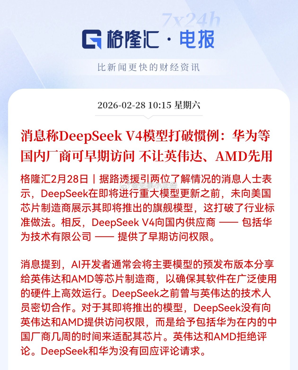 消息称DeepSeek V4模型打破惯例:华为等国内厂商可早期访问 不让英伟达、