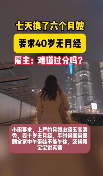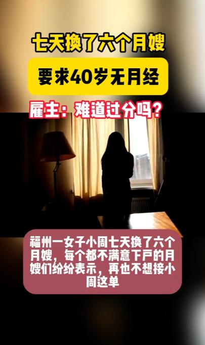 福建,一女子想雇住家月嫂,要求40岁已经绝经的女子,并且要长得好看,服从管理,还得是高知分子、会讲英语,中午要照顾孩子不能午休,平时还得顺带照顾全家。女子自称自己要求简单,可之后她7天时间里换了6个月嫂,她十分纳闷:难道自己的要求很过分吗? 福建一位刚生完宝宝的宝妈,最近在家政行业里闹出了不小的动静,短短一周的时间里,接连更换了六位上门服务的住家月嫂,可她本人始终满脸困惑。 甚至对着家政工作人员不停吐槽,自己提出的每一项要求都特别基础,怎么就找不到一个能胜任的人,难道这样的条件真的算苛刻吗? 这位宝妈要找的是全天候住家的月嫂,从一开始就划定了极其特殊的硬性门槛,年龄必须卡在 40 岁,而且还得是已经完全绝经的女性。 她给出的理由是,这个年纪没有生理期的困扰,照顾刚出生的宝宝时能更专心,不会因为身体不适耽误照料工作。 可从女性生理健康的公开数据来看,我国女性自然绝经的平均年龄在 49.3 岁左右,40 岁就进入绝经期属于早绝经范畴,这类人群在适龄女性中的占比仅有 3.1%,本身就是极少数的群体,单是这一条要求,就直接筛掉了市面上绝大多数的月嫂人选。 更现实的是,早绝经的女性大多会出现体力下滑、睡眠变差等身体状况,本身就需要适当休养,根本很难扛住月嫂 24 小时连轴转的高强度工作。 除了年龄和生理上的特殊要求,宝妈还对月嫂的外在形象有明确规定,要求长相好看、气质得体,日常相处起来要顺眼。 工作态度上更是要求绝对服从安排,不管自己提出什么要求,月嫂都要立刻执行,不能有任何质疑、反驳或是推脱的想法,在她看来,花钱雇佣的服务人员,就该完全按照雇主的节奏来做事。 能力方面的要求更是横跨了好几个职业领域,月嫂不光要懂专业的母婴护理,还得是高知分子,拥有不错的学历,同时还要能熟练使用英语交流,说是要从新生儿阶段就给宝宝打造双语环境,做早期的语言启蒙。 工作时长上更是没有任何缓冲空间,中午宝宝休息的时间段,月嫂必须全程守在身边看护,连十几分钟的短暂午休都不被允许。 而且住家服务的范围远不止照顾宝妈和宝宝,全家人的日常饮食、家里的清洁家务、各类杂物打理,都要月嫂顺带一并包揽,相当于把月嫂、保姆、早教老师、家庭管家的工作,全都压在了一个人身上。 宝妈一直觉得,自己没有提过分的薪资要求,只是想找个各方面都合适的帮手,这些条件再普通不过。 对接的家政经纪人做了十几年母婴护理中介,第一次碰到这么刁钻的需求,当场就跟宝妈说明,这样的条件组合在一起,在整个家政市场里几乎找不到匹配者。 符合 40 岁绝经条件的月嫂,大多没有接受过高等教育,更别说掌握英语技能,而拥有高学历、会双语的育儿从业者,年龄基本在 30 到 35 岁,远没到绝经的阶段。 可宝妈根本听不进劝,执意要按自己的标准筛选,经纪人无奈之下,只能动用全部资源挨个推荐人选。 七天下来,有六位月嫂轮番上门,又接连被辞退,没有一位能稳定胜任这份工作,宝妈看着不断更换的月嫂,心里越发委屈。 她始终想不通,自己只是想找个靠谱的人打理宝宝和家庭琐事,怎么就成了不可能完成的事,甚至觉得是现在的家政人员不够敬业,连基本的工作要求都做不到。 从正规家政行业的标准来看,住家月嫂的服务范围有着清晰的界定,核心工作只围绕新生儿照料和产妇护理展开,包括宝宝的喂养、抚触、黄疸监测,产妇的月子餐制作、产后恢复指导等,照顾全家、包揽全屋家务并不在基础服务内。 而且住家月嫂属于 24 小时待命的岗位,行业内默认每天需要 6 小时以上的碎片化休息,中午的短暂午休,是保证护理质量的必要前提,长期剥夺休息时间,不仅会让月嫂精力透支,还可能因注意力不集中影响母婴护理安全。 目前市场上,会英语、懂早教的高知育儿嫂属于稀缺资源,在福建这类城市,月薪普遍在 12000 元以上,而这类从业者更看重工作边界和人格尊重,绝不会接受无条件服从、无休息的工作模式。 宝妈想用普通月嫂的薪资,聘请到集多种技能于一身的全能人员,本身就脱离了市场实际。 这件事在网络发酵后,不少资深月嫂和家政从业者都纷纷发声,有从业十几年的月嫂表示,做了这么多年母婴护理,第一次听说招月嫂还要限定绝经年龄,还要兼顾颜值、学历、英语和全家家务。 很多有过雇月嫂经验的宝妈也分享,刚生产完想找靠谱帮手的心情能理解,但任何工作都有底线,清晰的服务边界,才是找到合适帮手的前提。 七天换六位月嫂的结果,从来不是月嫂不够优秀,而是这份从一开始就脱离现实的招聘要求,本就很难找到合适的人。 在家政服务的选择里,从来没有十全十美的全能人选,只有贴合实际的合理匹配,这也是无数家庭聘请家政人员时,最该认清的现实。 对于这件事,您有什么想说的吗?欢迎评论区留言讨论。 信源:幸孕母婴-安心月嫂2025-06-16——《找个四十绝经的月嫂有这么难吗?》