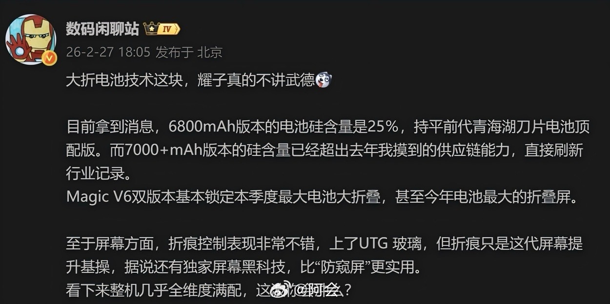 憋了这么久,终于能跟大家分享一下我对荣耀Magic V6的印象了。很难想象在保持极致轻薄手感的同时,竟然能塞这么大的电池。6800mAh版本的硅含量卷到了25%这一前代顶配水准。“领先两代”的续航,真的给了用户久违的安全感。细节控最在意的屏幕也有全维度进化。补齐了 UTG 玻璃,指尖划过几乎察觉不到起伏。再加上那个还不能说的独家屏幕黑科技,还有满血的8E5芯片,算是今年最值得入手的满配折叠旗舰了。