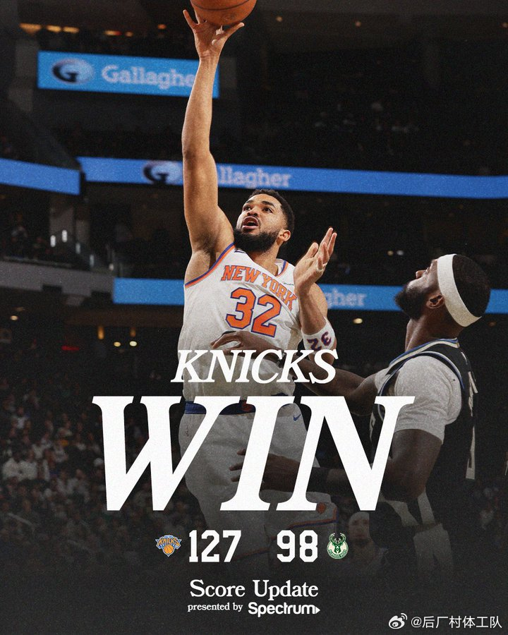 尼克斯127-98大胜雄鹿,布伦森发挥出色得到27分7板3助,阿努诺比砍下24分3板3助2断,雄鹿方面特纳19分4板2助、库兹马17分4板2助。