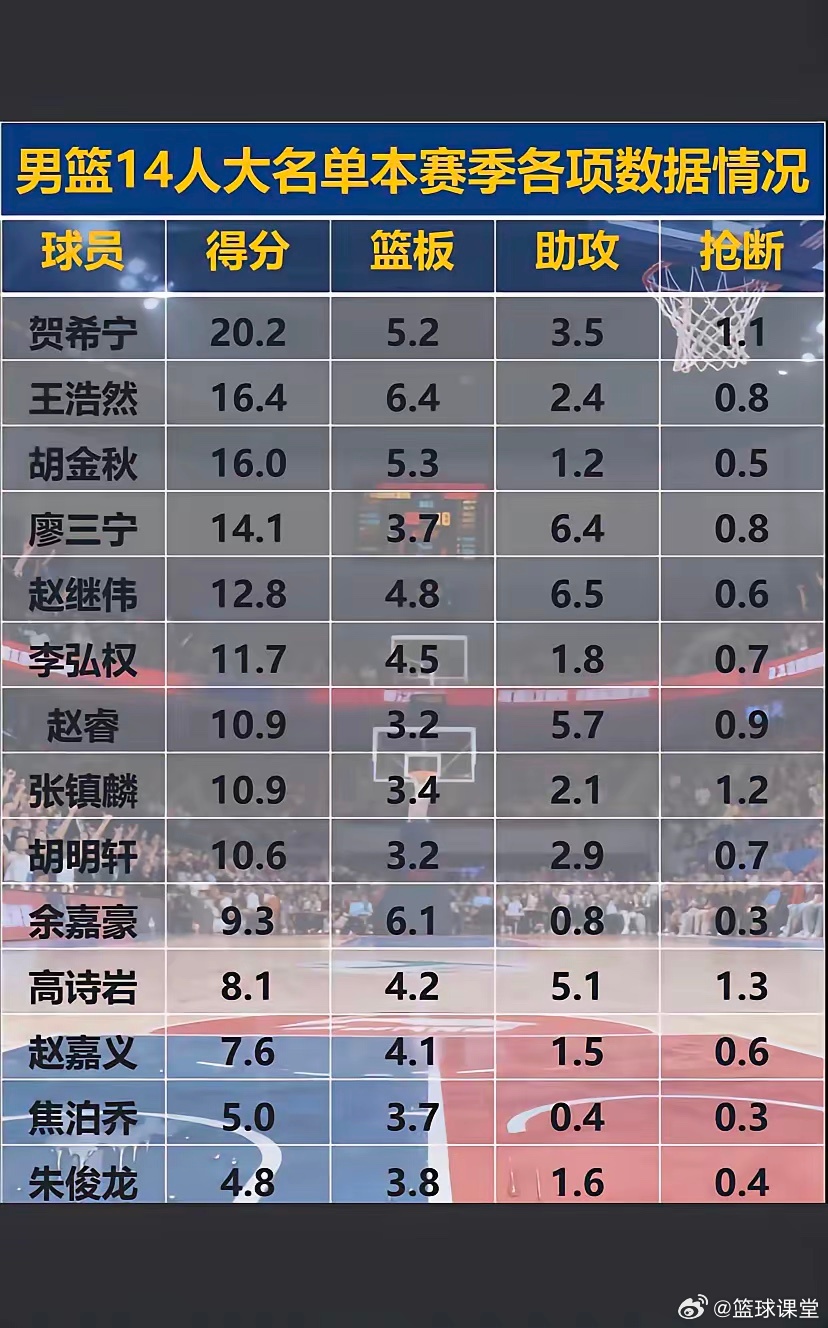 男篮14人大名单CBA赛季数据