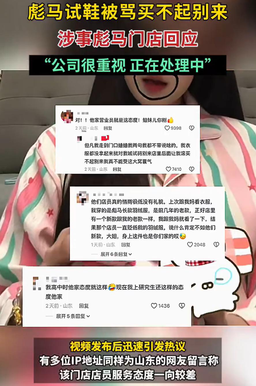 吵翻天!山东滨州,一女子想要买鞋,连续两天到彪马门店试鞋,第一天店员没说什么,可第二天店员认出她,女子试鞋没买后,店员当初发飙:“买不起别试”,女子觉得自己被侮辱,直接把这个事发到网上曝光,这个事也引起了不少网友的讨论 女子介绍,她近期想要买一双鞋子,但比较纠结款式,头天去店里试了试,没找到特别中意的,就走了 第二天她琢磨着可能还有别的款式没看到,又去了这家店,想让店员帮忙从仓库拿双鞋试试。结果,店员认出她来了,给她到仓库翻了一圈鞋,试穿后又没买,这下不仅脸拉得老长,还直接甩出来一句:买不起就别来试,试什么试 这话搁谁身上能受得了?女子当时就感觉被侮辱了,自己只是想买到一双合脚的鞋,多对比一下怎么了?难道进店就必须掏钱?一气之下,她把这事发到了网上 目前,门店方面回应说公司很重视,那个骂人的店员这几天没来上班,估计是被停职了 这事一出来,评论区自然分成了两派 大部分人都在吐槽店员,说实体店现在本来就难做,电商那么方便,大家还愿意去店里,图的就是能试试、摸摸实物,如果连试都不让试,那实体店跟线上比还有什么优势? 但也有一小部分人觉得,这女子连着去两天,光试不买,也确实是有点考验店员的耐心,毕竟人家站一天也累,要是都这么试,生意还做不做了? 在我看来,我觉得还是更认可第一种观点 干服务行业,最基本的就是耐心。你哪怕心里觉得这顾客可能不会买,面上也得过得去。买卖不成仁义在,今天她只是逛逛,明天可能就带朋友来买了 店员就算猜对了顾客可能不买,也不能把这句话说出来,一说出来,你就输了。顾客哪怕真的是来比价的,只要在店里,就是消费者,理应得到尊重