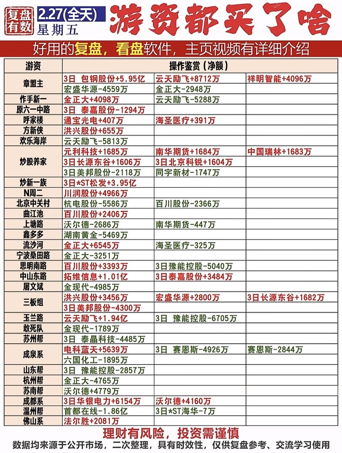 2月27日的A股游资战场超热闹!当日A股延续结构性震荡行情,两市成交额活跃。 龙虎榜数据显示,游资围绕战略资源、算力通信两大核心主线布局,“弃高就低、聚焦主线”特征明显。章盟主三日累计净买入包钢股份近6亿,华胜天成、包钢股份、拓维信息分别获主力资金净流入47.09亿、25.99亿、22.41亿。 小金属板块成资金争夺核心,T王狂抢小金属龙头,多路资金做T调仓。全市场游资与机构龙虎榜总成交143.83亿,较前一日增长12.7%,交投活跃度提升。搞懂游资动向和资金逻辑,比盲目跟风重要多啦!