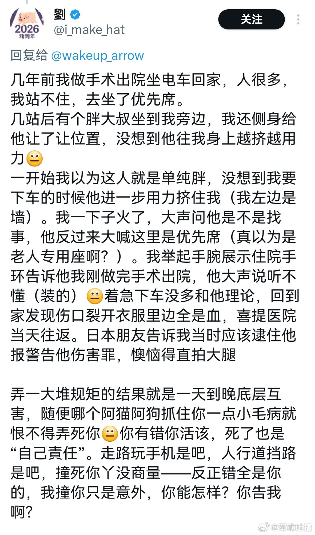 在日华人分享在日本坐电车被撞人党故意挤压,导致伤口破裂,衣服上全是血,当天返回医院重新治疗日本社会规矩太多,导致所有人都很压抑,抓住别人一点小错就想整死,完全没有人性,就是极致的底层互害