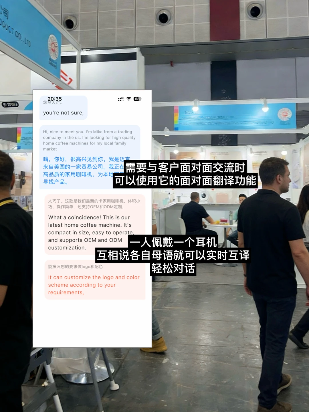 ✅需要与客户面对面交流时,可以使用它的面对面翻译功能,一人佩戴一个耳机,互相说各自母语就可以实时互译,轻松对话。