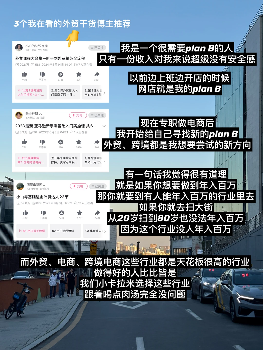 然后我发现做外贸就是一个很适合我的plan B,因为我售卖的产品本身就很适合出口,在国外也比较受欢迎,对我来说做外贸就是一个天时地利人和的选择,图片整理了一些我自己做的外贸电商干货,有需要可以自取~