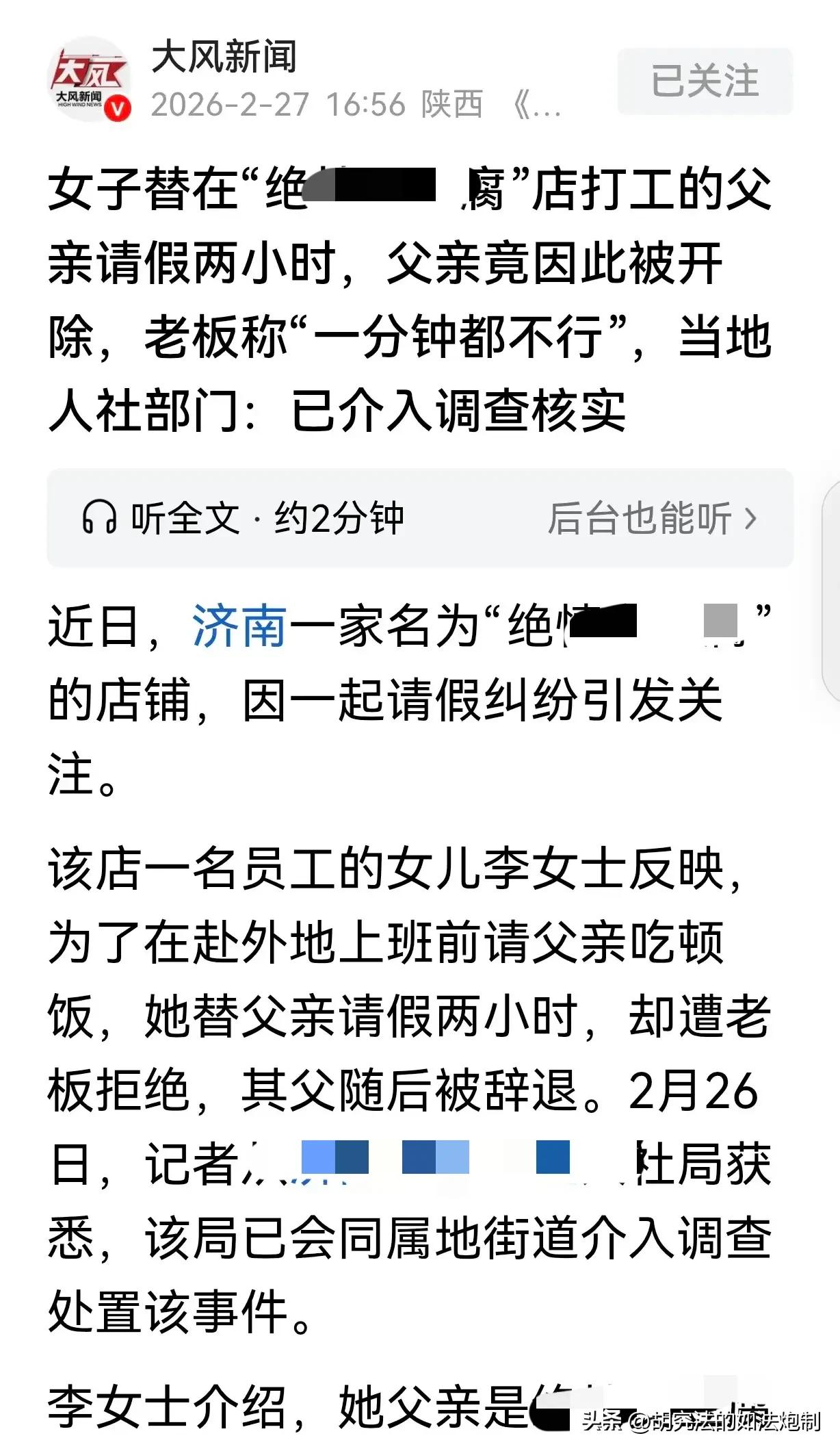 这老板火了!山东济南,一女子外出打工之前,打算跟父亲吃一顿饭。于是在晚上11点的时候来到父亲打工的臭豆腐店,想给父亲请假2个小时。谁知老板一口回绝,说“别说两个小时,一分钟都不行!”父亲为了保住工作只能妥协,谁知老板还是把父亲辞退了。女子气不过来到店门口理论,“春节就休息了1天,平时经常加班也没加班费,太不近人情了!”网友:怪不得店铺叫这个名字,很贴切! 春节假期转瞬即逝,回到老家的李女士又要收起行囊,奔赴千里之外的杭州,开启自己一整年的打工生涯。 在外打工的日子虽然很辛苦,不过李女士还能克服,唯一让她割舍不下的就是把自己的父亲留在老家,父女两个人往往一别就是一年才能再相见。 可就算相处的日子已经很短了,由于父亲在一家臭豆腐店打工,越是到春节假期,工作反而会更忙,只有在大年初一的那一天,父亲才放了一天假。 其余的时间别说正常下班了,加班加点也成了常态。 李女士打算在出发之前好好的跟父亲唠一唠,顺便也能一起吃顿饭。 不过李女士也想到,毕竟还处于春节假期期间,客流量也明显比之前更多,白天的时候父亲肯定没空,那就把吃饭的时间安排在晚上。 到了初五的那天晚上,李女士看了看时间已经9点多了,他猜测现在人流量肯定要比白天少很多,这个时候请假应该不会给老板带来什么影响。 李女士拨通了父亲老板的电话,打算给父亲请两个小时的假,还说明了请假的原因。 没想到这个看似非常合理的要求,竟被老板一口回绝了。 老板甚至还气呼呼的表示别说两个小时了,就算一分钟也不行。 说完便挂断了电话。 打工又不是卖命,谁家还没有一点临时的事情呢?凭什么不能请假? 然后还没等李女士反应过来,父亲就收到了老板的电话。电话的那头老板强硬的表示,坚决不同意请假,否则就面临辞退。 闺女一直都在,春节一年一个,可工作说没可就没了。 李女士的父亲本来就没有什么手艺,再加上年龄大了找工作自然就比较困难。 虽然他也非常希望能跟女儿好好的吃一顿饭,可是为了一顿饭就丢掉工作,父亲想了想,感觉还是有些不值得,于是决定这顿饭先别吃了,等以后有机会了再说。 可让李女士以及父亲没想到的是,老板不知道抽了哪门子的风,明明没有请假,父亲却被辞退了。 看着父亲失魂落魄的回到了家,李女士被气得浑身发抖。 他知道父亲的为人,对待工作一直勤勤恳恳,哪怕天天加班,而且还没有加班费父亲也从来没有抱怨过。 这才请两个小时的假而已,又不会影响店铺的生意,老板为什么就要狠心把父亲辞退呢? 越想越生气的李女士决心要为父亲讨个说法,于是来到臭豆腐店门口找老板理论起来。双方的争吵声,很快便引来吃瓜群众的围观。 【网友热议】 “这家店的老板实在太不近人情了,仅仅是请假两个小时而已,不仅不同意还把员工给辞退了,卖的臭豆腐臭,人品也臭!” “平时经常加班,还不给加班费,到底是谁给老板的勇气?” “老板肯定有老板的难处,春节期间本来人流量就高,如果在这个时候请假的话,店里肯定忙不过来,忙不过来就耽误挣钱。” 【案例解析】 这个事件也揭露了当今社会一个普遍的现象,像臭豆腐这种小型的餐饮店,管理者几乎没有保障员工权益的意识。在他们的眼中,维持正常的经营,能够挣钱才是王道。 殊不知他们的行为已经构成违法了。 根据《劳动法》第四十一条规定,用人单位由于生产经营需要,和劳动者协商后可以延长工作时间,一般每日不得超过一小时; 因特殊原因需要延长工作时间的,在保障劳动者身体健康的条件下延长工作时间每日不得超过三小时,但是每月不得超过三十六小时。 臭豆腐店老板在春节假期期间仅给李女士的父亲放假一天,平时的时候正常上班,而且没有加班费,他的行为已经违反了上述法律。 无论他所经营的店铺规模大小,最起码应该保障员工的合法权益。 为什么臭豆腐店老板如此有恃无恐?一方面可能老板确实不懂这方面的法律,最主要的原因还是作为普通的劳动者,没有保护自己权益的意识。 对此你怎么认为?