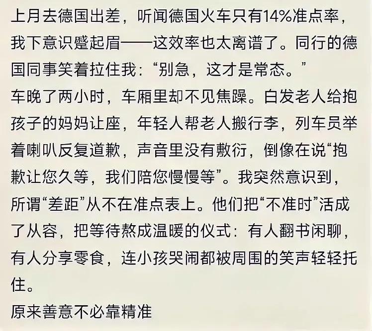 现在明白公知的读者意林笔法了,他遵循三个原则,第一,如果火车准时到达,这充分说明德国人的严谨,第二,如果火车从来不准时,那么可以从中看出德国人的松弛感。第三,如果火车既不准时乘客还不抗议,那就说明德国人不仅松弛还包容还有人情味。 公知那套“造神话术”,本质就是不管事实怎么变,都能硬往自己的预设里套,纯纯的双标逻辑,骗骗没见过世面的年轻人还行,对上了年纪的人根本没用! 毕竟现在信息透明了,谁没走过几个地方、没看过几眼世界?公知那套脱离实际、刻意拔高的话术,再也骗不过有阅历、明是非的人了!