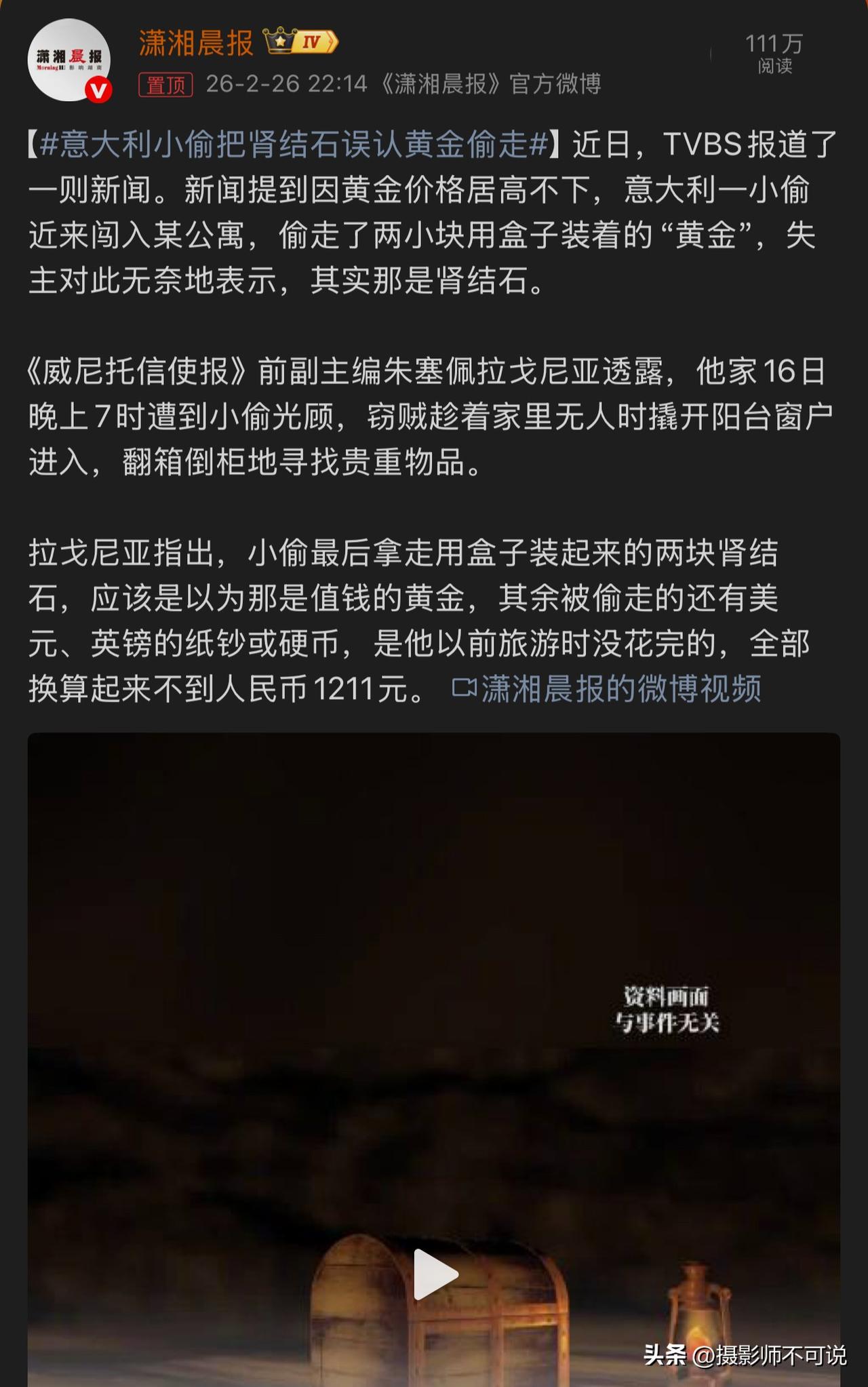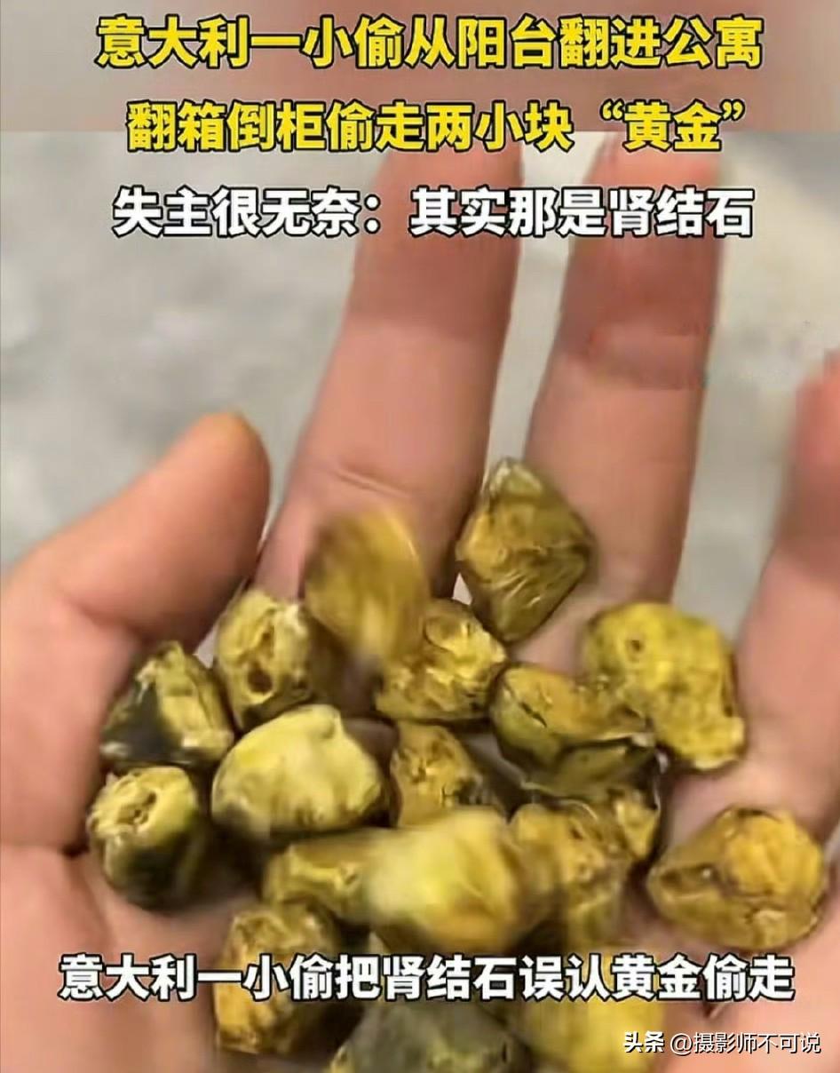 意大利小偷证明了哪怕当贼都必须有专业知识,否则可能在饿死之前就被笑死了!由于最近黄金价格飞起,很多人一看见黄灿灿的东西眼睛就会发亮。比如意大利小偷,翻阳台进入失主家看见一些黄灿灿的的东西装在盒子里面,以为是黄金。于是就直接顺走,我想他当时心情一定开心死了。结果失主回来发现后哭笑不得,那些黄灿灿的东西原来只是肾结石而已。不知道小偷把这“黄金”拿去销赃时会被笑话成啥样?所以说小偷如果没知识,连黄金都会认错。黄金密度和结石密度恐怕是天渊之别吧,但凡有点儿物理知识的都不至于闹出这种初级错误吧!