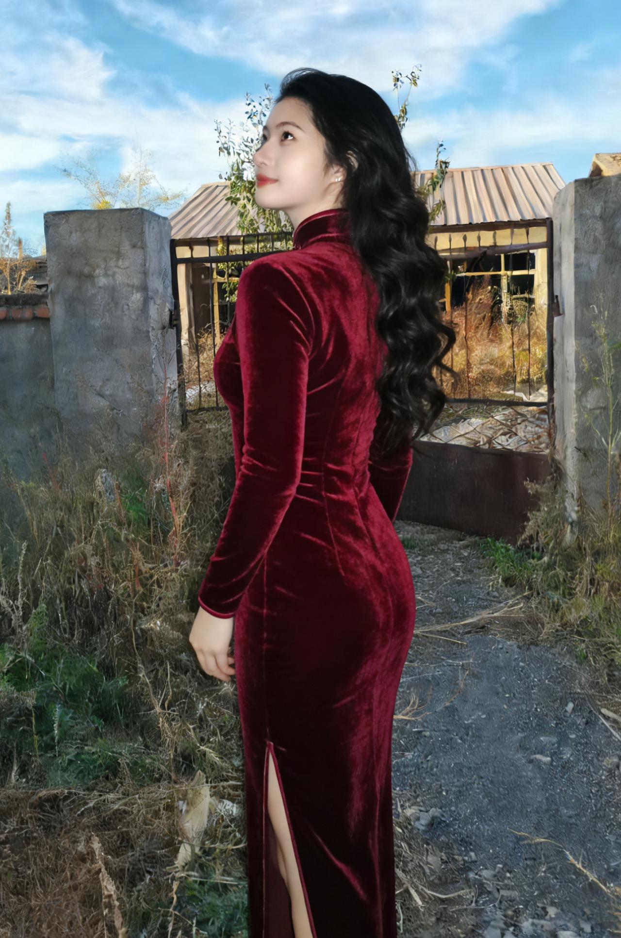 丝绒的红,像一团燃烧的火 在荒院里,显得格外刺眼 我站在铁门前,背对着世界 像一个被遗忘的皇后 ~ 旗袍的开叉,露出一截小腿 像一段被截断的时光 风从门缝里钻进来,带着枯草的气息 我听见,自己的心跳 和远处的狗吠,在空荡的院子里 撞出细碎的回响 ~ 我想起,小时候在戏台上 穿着戏服,扮演着别人的人生 如今,我站在这里 穿着旗袍,却找不到 那个可以为我画眉的人 阳光落在我的发梢 我突然明白,所有的繁华 都不如,一段平淡的时光