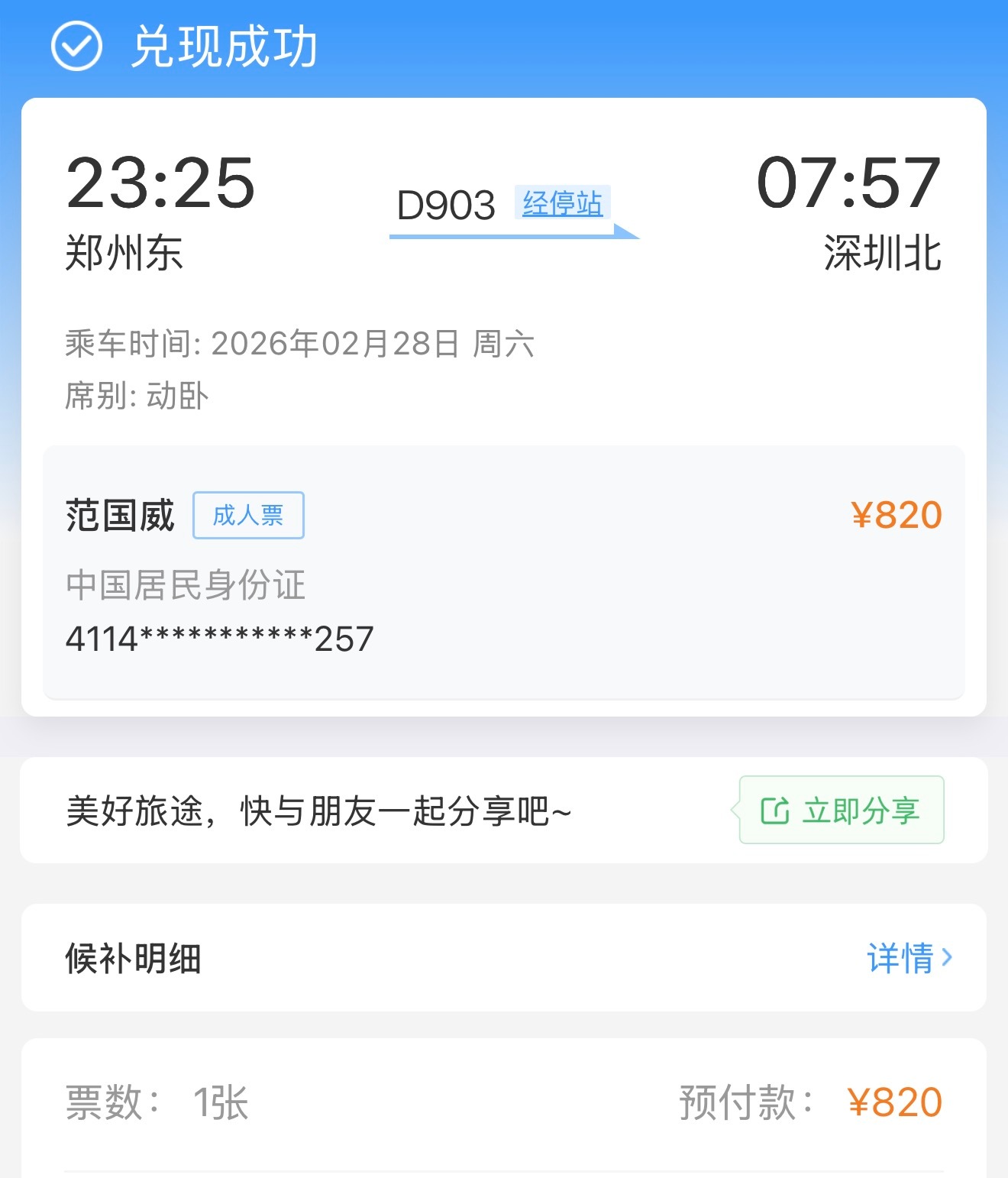 高铁卧铺票已经候补成功,今晚郑州东-深圳北,明天IP切换广东