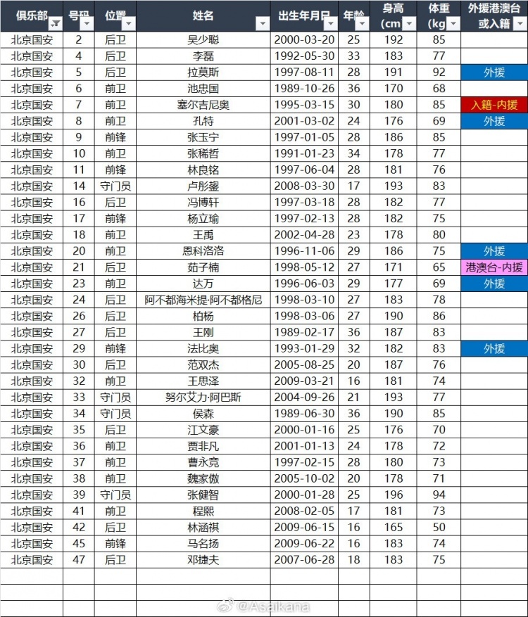 国安超级杯名单:门将:14-卢彤鋆、33-努尔艾力·阿巴斯、34-侯森、39-张健智后卫:2-吴少聪、4-李磊、5-拉莫斯(F)、16-冯博轩、21-茹子楠、24-阿不都海米提、26-柏杨、27-王刚、30-范双杰、35-江文豪、42-林涵祺、47-邓捷夫前卫:6-池忠国、7-塞尔吉尼奥、8-孔特(F)、10-张稀哲、18-王禹、20-恩科洛洛(F)、23-达万(F)、32-王思泽、36-贾非凡、37-曹永竞、38-魏家傲、41-程熙前锋:9-张玉宁、11-林良铭、17-杨立瑜、29-法比奥(F)、45-马名扬