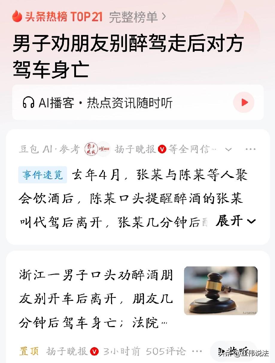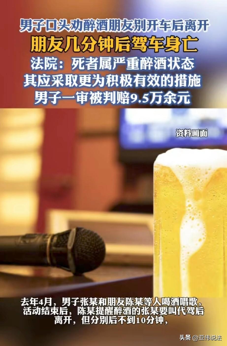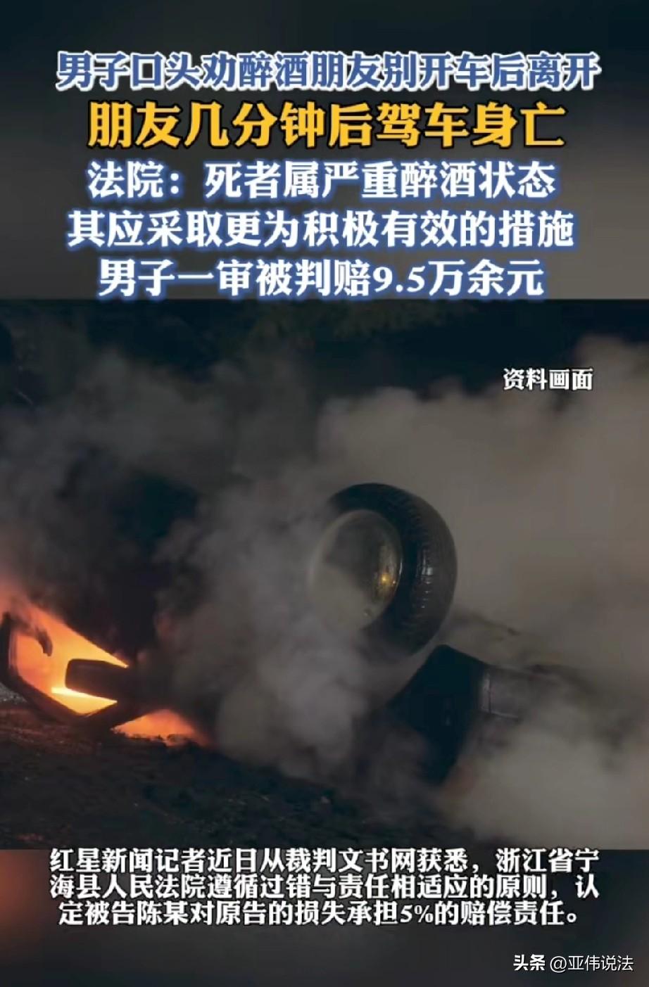 太冤了!浙江,男子和朋友在KTV聚会,散场时,朋友喝大了,男子还专门叮嘱他:千万别开车,一定要叫个代驾。朋友应了两声,男子以为他听进去了,便先行离开。万万没想到,几分钟后,朋友就出了车祸,不幸身亡。家属,悲痛欲绝,认为男子作为好哥们和同饮者,没有尽到安全保障义务,转脸将他告上法庭。随后,法院的判决让他直喊冤。 2025年4月某个晚上,夜生活刚刚开始。张某和几个朋友约在一家KTV喝酒唱歌,其中就有他的兄弟陈某。 包厢里气氛热烈,几个人推杯换盏,一直闹到深夜才散场。 散场的时候,大家站在KTV门口告别,陈某注意到张某走路已经有点摇晃,说话也不太利索,明显是喝多了。 他知道张某是开车来的,便拍了拍张某的肩膀提醒他,喝成这样可千万别开车,叫个代驾吧。 张某含含糊糊地应了一声,陈某见他应了,也就没再多想,自己先打车回家了。 谁能想到,陈某刚离开不到十分钟,悲剧就发生了。 醉酒的张某发动了车子,开出去没多久,车子就失控撞上了路边的警示桩和道路指示牌的T型杆。 剧烈的撞击后,车子突然起火,张某被困在车里,没能逃出来。 家里的顶梁柱就这么没了,张某的家人悲痛欲绝。 在处理后事的过程中,他们得知陈某当晚是和张某一起喝酒的人,而且陈某先走了。 家人认为,作为酒友,更作为兄弟,陈某没有尽到照顾义务,应该对张某的死负责。 于是,一纸诉状把陈某告上了法庭。 法庭上,陈某觉得很冤枉,他表示,自己临走时明明提醒过张某别开车,让他叫代驾,作为一个朋友,该说的都说了,还能怎么样? 张某是个成年人,自己喝醉了还要开车,这能怪别人吗? 法院审理过程中,检测结果显示,张某血液里的酒精含量高达177mg/100ml,已经属于严重醉酒状态。 在这种情况下,他的判断能力和控制能力都大大下降。 作为一起喝酒的同伴,陈某负有的注意义务,不应该只是一句轻飘飘的“别开车”。 他应该采取更积极有效的措施,比如帮张某叫好代驾,或者联系他的家人来接,甚至直接把他送到安全的地方休息,而不是口头提醒一下就走了。 《民法典》第1165条第一款规定:行为人因过错侵害他人民事权益造成损害的,应当承担侵权责任。 陈某与张某共同饮酒,使张某陷入严重醉酒、自控力显著下降的危险状态,由此产生法定的安全注意与照顾义务。 该义务不限于口头提醒,还应包括有效劝阻酒驾、协助联系代驾或家属、护送安置等可落地的保障措施。 陈某仅口头提醒便自行离开,未采取实质行动阻止醉驾,属于未尽到合理注意义务,应承担相应侵权责任。 张某作为完全民事行为能力人,对醉酒驾车的高度危险具有完全认知,仍执意驾驶导致身亡,自身存在重大过错。 依据过失相抵规则,应大幅减轻陈某的赔偿责任。 综上,法院认定陈某对张某的死亡承担5%的赔偿责任,判决他赔偿张某家属各项损失95898.5元。 这个判决一出,网友立马炸开了锅。 陈某太冤了,一个成年人自己非要作死,凭什么让别人买单?要是这样,以后谁还敢和朋友喝酒? 也有人调侃,按这个逻辑,酒厂也该赔钱,他们生产的酒,怎么不提醒人少喝点? 当然也有人觉得法院判得有道理,人都醉成那样了,作为朋友光动动嘴皮子就走,确实说不过去,真出了事,良心上过得去吗? 把每一个喝醉的人安全送回家,要作为聚会的默认规则,谁组织,谁牵头;谁顺路,谁负责。 哪怕只是把他塞进出租车,拍下车牌号发给他的家人,这个动作本身,就是尽了最大的注意义务。 一场原本开心的聚会,最后却落得个家破人亡、朋友反目成仇的结局,所以我们要始终牢记:喝酒不开车,开车不喝酒! 对此,你怎么看?