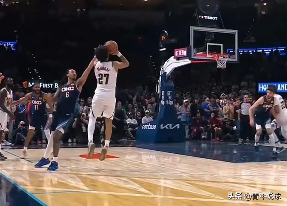穆雷时刻!24秒连得9分! 今天掘金队客场挑战雷霆队的比赛,加时赛最后28.6秒,掘金队以112-121落后9分之多,比赛已经基本上失去了悬念。万万没想到这时穆雷突然发力,他在24秒内连续命中了3记三分球,每个都是迎着防守的高难度投篮,一度将分差缩小至4分。只可惜落后太多,雷霆队的罚球也非常稳定,穆雷最终无力回天,球队也以121-127不敌雷霆队。