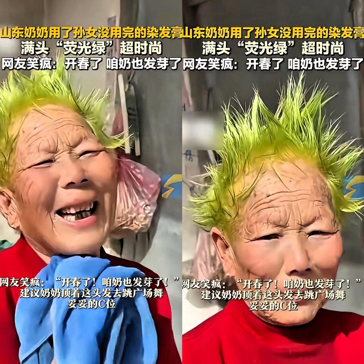“笑不活了!”山东这位奶奶用孙女剩下的染发膏给自己染了个头,结果直接变身“绿野仙踪”!这波操作看似意外,实则藏着生活最动人的智慧。 老人一辈子节俭惯了,看到孙女没用完的染发膏,第一反应不是扔掉,而是想着“别浪费”。 没有说明书、没研究色号,凭着模糊印象就给自己上手,这份说做就做的勇气,可比很多年轻人强多了。 染完发现是浅绿色,她没尴尬没懊恼,反而笑得坦荡,这份对生活的热爱,哪有什么年龄限制? 家人有夸有劝,老人却坚持按自己的节奏来,第二天照样顶着绿头发出门遛弯。这哪是“翻车”?分明是给平淡日子添了抹亮色! 年龄从来不是阻碍,节俭更不是守旧,只要心怀欢喜,生活处处是惊喜。