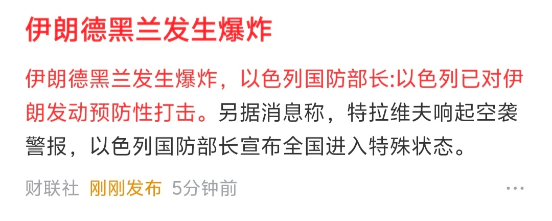 财联社:伊朗德黑兰发生爆炸,以色列国防部长:以色列已对伊朗发动预防性打击。 以色列宣布袭击伊朗