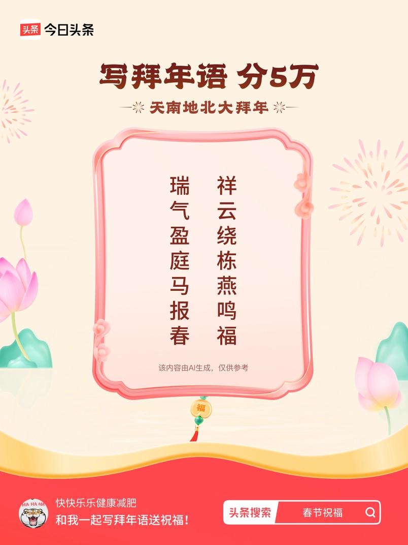 写拜年语送祝福新春拜年送祝福!我的祝福是:“瑞气盈庭马报春,祥云绕栋燕鸣福”!快来一起写祝福吧戳这里,一起领红包>