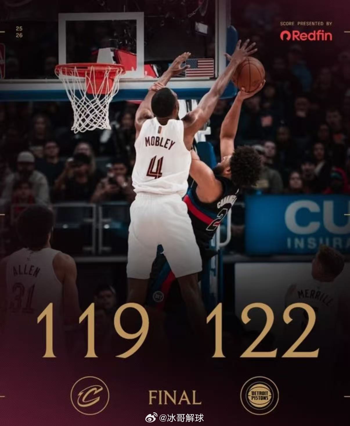 骑士vs活塞NBA常规赛,活塞主场经过加时以122-119击败骑士!双方打得十分胶着,骑士多名主力缺阵仍拼至最后,活塞内线发挥出色,关键球把握更好,惊险拿下本场胜利。