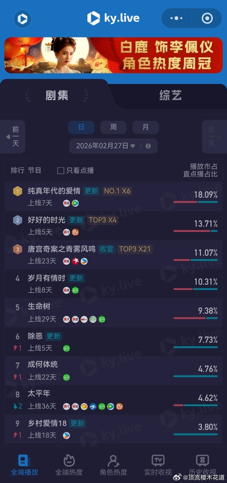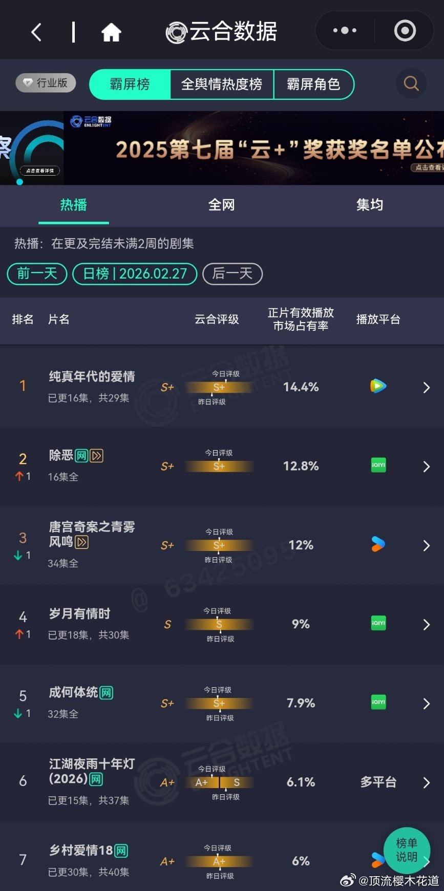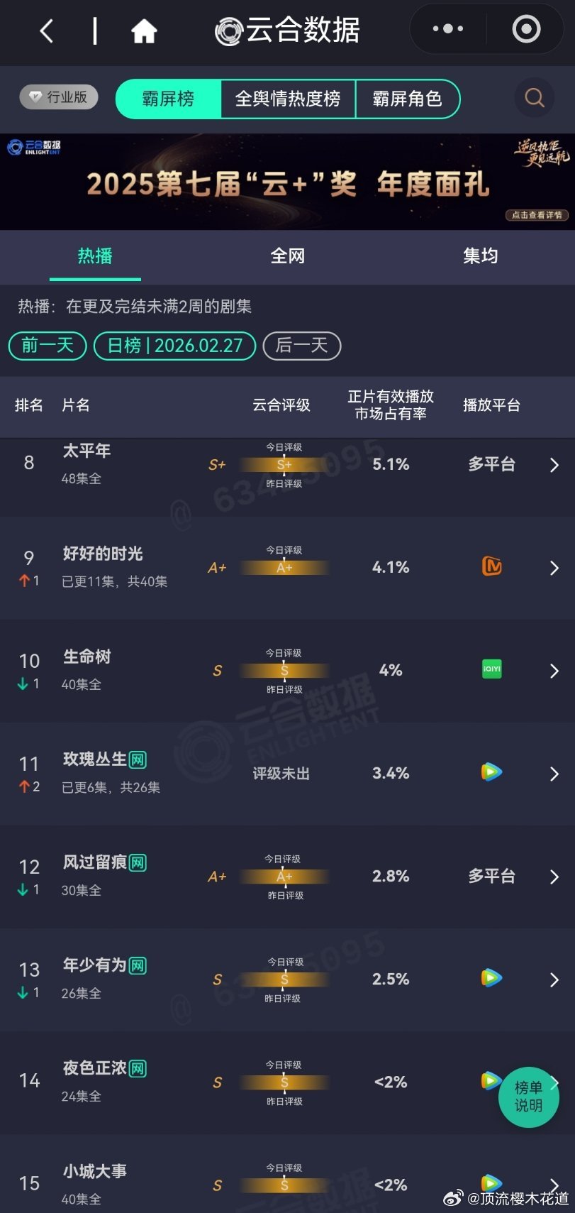 2月27日云合播放占比云合 VS酷云纯真年代的爱情14.4%评级大幅上升除恶12.8%评级S+岁月有情时9%评级下降江湖夜雨十年灯6.1%评级掉到A+了。生命树4%酷云点播比云合高,云合该反思下自己了。玫瑰丛生3.4%翻倍失败,正常水平