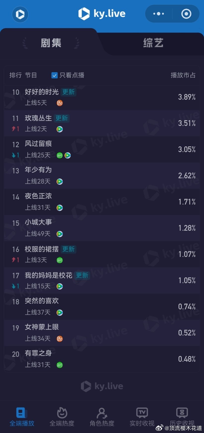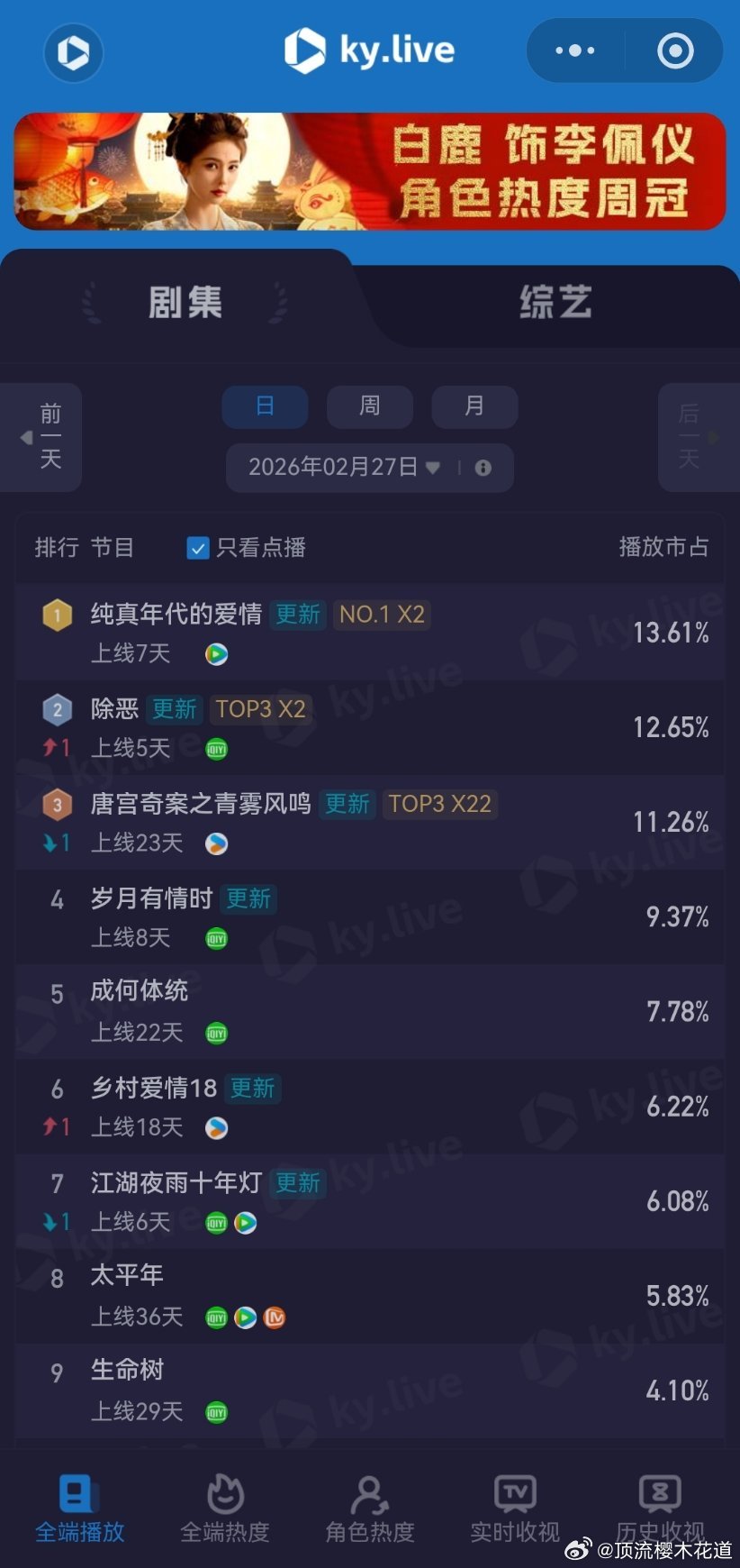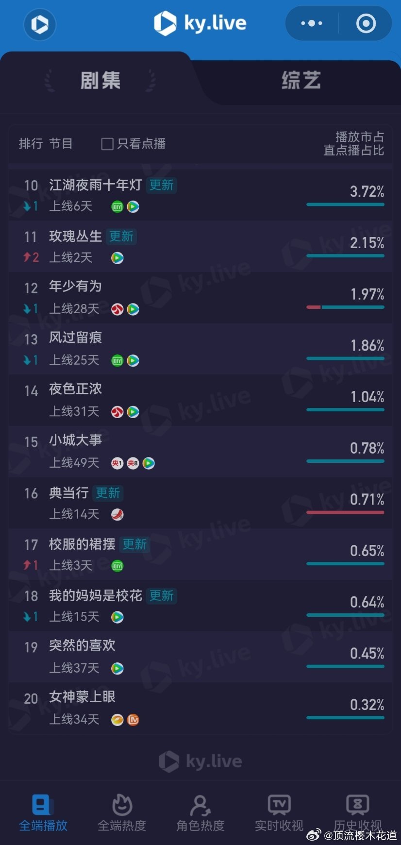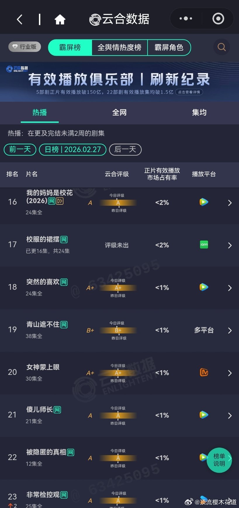 2月27日云合播放占比云合 VS酷云纯真年代的爱情14.4%评级大幅上升除恶12.8%评级S+岁月有情时9%评级下降江湖夜雨十年灯6.1%评级掉到A+了。生命树4%酷云点播比云合高,云合该反思下自己了。玫瑰丛生3.4%翻倍失败,正常水平