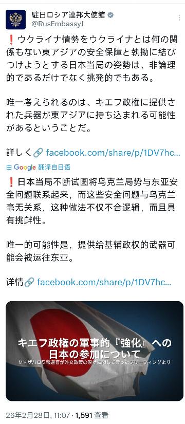 俄罗斯驻日本大使馆今天(2月28日)对日本喊狠话:“日本当局试图将乌克兰局势与毫无关联的东亚安全问题强行联系起来的做法,不仅缺乏逻辑性,而且具有挑衅性。 唯一可以想到的是,提供给基辅政权的武器有可能被带入东亚地区。” 日本当局近来多次在公开场合炒作,把欧洲的乌克兰局势和东亚地区的安全问题强行挂钩,甚至还拿所谓的“地区安全威胁”说事,明里暗里渲染紧张气氛,试图为自己扩充军力、加强对外勾结找借口。 俄罗斯驻日大使馆直接点破了这种操作的不合理性,俄乌冲突有其自身的历史经纬和现实背景,本质上是欧洲地区的局部冲突,和东亚安全问题没有任何直接关联,日本非要把两者绑在一起,根本站不住脚。 更值得警惕的是,俄罗斯驻日大使馆还抛出了一个关键担忧,他们直言,唯一能想到的日本这么做的原因,就是日本提供给基辅政权的武器,有可能被偷偷带入东亚地区,这无疑会给东亚地区的安全稳定埋下巨大隐患。 了解情况的人都知道,日本近年来一直在不断放宽防卫装备出口的限制,打破了战后长期以来的诸多禁忌,甚至多次向处于冲突中的乌克兰提供各类军用物资,从防弹背心、防寒服到相关技术支持,一步步突破自身的政策底线。 日本当局一边不断向乌克兰输送各类涉军物资,一边又在东亚地区频频搞动作,一会儿和北约加强互动,一会儿在周边地区强化军事部署,还总炒作“东亚安全受到威胁”,这种前后矛盾的操作,难免让人怀疑其真实目的。 俄罗斯驻日大使馆的这番狠话,并不是凭空发泄不满,而是基于日本近期的一系列实际行动做出的回应,也是对日本当局的严厉警告。 毕竟东亚地区的安全稳定,需要的是相关国家秉持客观公正立场,通过对话协商妥善处理分歧,而不是像日本这样,故意拉来无关的国际冲突搅局,更不能放任援助出去的武器流入东亚,破坏地区的和平与稳定。 日本当局一直试图借助俄乌冲突,不断突破自身的军事限制,还想把北约等外部势力引入东亚地区,这种做法本身就极具挑衅性,也严重破坏了东亚地区的安全平衡。 俄罗斯驻日大使馆明确点出武器流入的风险,其实也是在提醒国际社会,日本的这些操作不仅会加剧俄乌冲突的复杂性,更可能给东亚地区带来不可预测的安全风险,必须加以警惕。 要知道,东亚地区的和平稳定,是所有周边国家共同的利益所在,任何国家都不能以牺牲地区安全为代价,谋求自身的私利,更不能故意制造对立、挑起紧张。 日本当局如果继续坚持这种错误做法,强行将乌克兰局势与东亚安全问题关联,甚至放任武器流入东亚,必然会遭到周边国家的反对,也会进一步恶化自身与俄罗斯等国家的关系。 俄罗斯驻日大使馆的这番表态,清晰传递出一个信号,俄方绝不会容忍任何国家借俄乌冲突搅乱东亚安全局势,更不会允许任何可能威胁地区安全的行为发生。 事实上,日本近年来的一系列军事动向,已经引起了周边国家的高度警惕,从不断增加防卫预算,到放宽武器出口限制,再到频繁与外部势力勾结,日本的每一步操作,都在偏离战后和平发展的轨道。 这次俄罗斯驻日大使馆直接喊出狠话,就是要给日本当局敲醒警钟,停止这种缺乏逻辑、带有挑衅性的操作,停止将无关冲突与东亚安全绑定,更要杜绝援助武器流入东亚的可能。 否则,一旦日本的这些不当操作引发地区安全危机,最终受损的不仅是东亚地区的和平稳定,也会让日本自身陷入尴尬的境地,毕竟没有哪个国家能在混乱的局势中独善其身。 俄罗斯驻日大使馆的表态,既是对日本当局的警告,也是对地区安全的负责,毕竟在复杂多变的国际形势下,只有所有国家都秉持客观公正、相互尊重的态度,才能维护好地区的和平与稳定,这也是每个国家应尽的责任。 日本当局现在最该做的,就是正视自身的错误,停止一切挑衅性操作,放弃将乌克兰局势与东亚安全强行关联的荒唐做法,切实遵守战后和平秩序,为东亚地区的安全稳定贡献积极力量,而不是继续添乱。