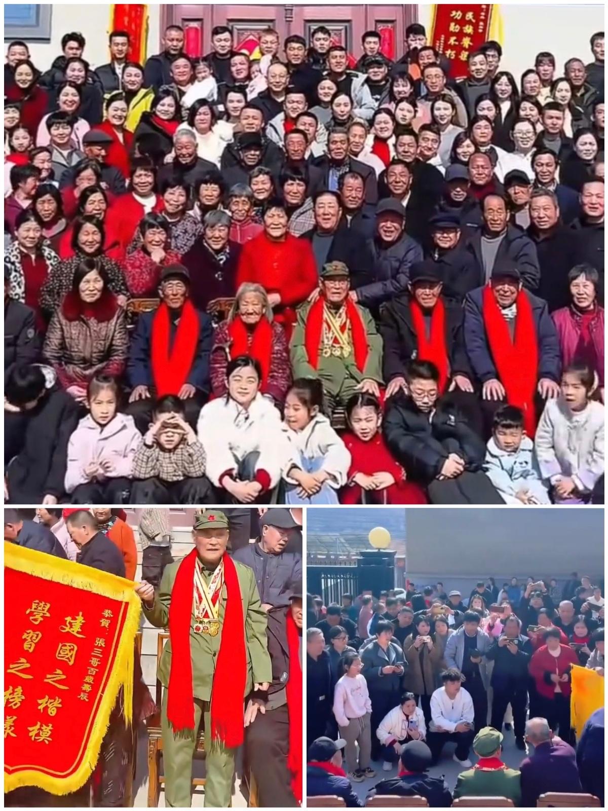 "血脉这种东西,真的割不断。"山东临沂百岁老兵过寿,孙子提前20天张罗,正月初三,210位亲人从全国各地赶了回来,20多桌流水席,12排全家福,最大100岁,最小才2周。 老人名叫张继学,今年正好一百岁,是一名老兵,目前五世同堂,全家共有240口人,分布在祖国各地的城市里。 操持这次寿宴的,是他58岁的孙子张明军。 提前二十天,张明军就开始给每个人打电话、发信息,把消息传到每个角落里去,他没有想把场面搞得多么大,只是希望回来的人多一点,能让老人们热闹地过生日。 结果那天,来了210个人。 从广州飞回来的、从上海坐高铁赶回来的、从北京连夜出发的,拖着行李箱、带着孩子、大包小包往老家赶,农家院里20多桌流水席从早上一直排到晚上,锅里的菜没有断过,院子里的笑声也没有停过。 拍全家福的时候,摄影师站在梯子上往下看,整整12排人,老人坐在中间的位置,旁边围满了儿子、孙子、曾孙、玄孙,最小的一个孩子刚满两周,被妈妈抱着,眼睛还没有睁开,但已经是这个大家族中的一员了。 这张照片,往后几十年都是传家宝。 现在的年轻人,堂兄弟都分不清,过年过节抢着不去家里,各种各样的理由推脱,其实心里知道并不是没有时间,而是觉得回去也没啥意思,年味淡了,人情味也淡了。 可是张家的210口人,硬是从全国各地赶到了一个县城的农家院。 不是有啥大事情,就是给老人过生日,就是聚一聚,这样的理由也足够了。 血脉不是挂在嘴边上的,是需要用腿走回去的。 张继学老人坐在院子里看着满院子的子孙,想必他心里没有什么话要说,在这一生中,很值了。 都说人情冷暖,血脉疏远,但是看这个家族,240口人,分布在天南海北,一通电话,210个人就回来了。 这才是家族真正的财富,并不是钱,也不是房子,而是一份无论你走到哪里、多久没有联系,只要呼唤一声就可以聚在一起的心。