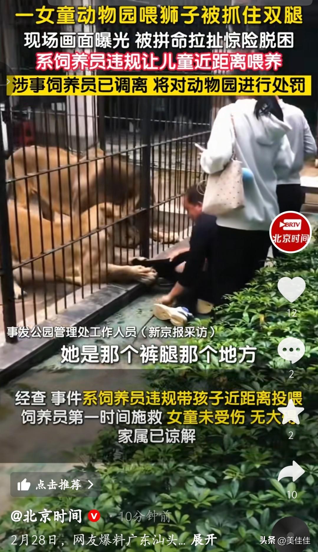 太恐怖了!女孩给狮子投喂的时候,直接被狮子抓住双腿,还拼命往笼子里拽!幸好黑衣男子拼命拉住女孩,才把她从狮子嘴里抢了回来,女孩吓得当场大哭。 这件事真的给所有家长提了个醒。带孩子去看动物,千万不能大意,别以为动物关在笼子里就百分百安全。猛兽的野性改不了,力气和攻击性都特别大。家长一定要看好自己的孩子,别让孩子靠近栏杆,更不要随便伸手投喂,遵守动物园的安全规定,才能避免出事。