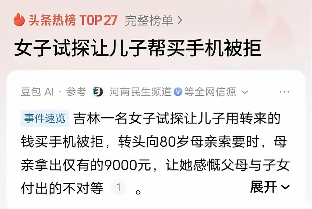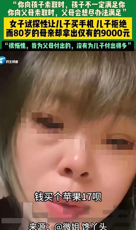 “可怜天下父母心!”吉林,女子收到儿子转的18000块钱,让她帮忙存起来,女子试探儿子问:我能拿这钱买个苹果17吗?儿子直摇头,拒绝道:不行,我好不容易攒的。下午,女子去80多岁的老母亲家,又试探说:妈,给我一万块钱,我想买手机。老母亲面露难色,说不太够啊。随后的做法却让女子瞬间泪目! 吉林有个女子,这天突然收到儿子转来的18000块钱,儿子特意跟她说,让她帮忙存起来,还反复叮嘱,这钱是自己好不容易攒下来的,让她千万别动。 女子听着儿子的话,心里既欣慰又有点小试探,就笑着问儿子,说自己想买个苹果17,能不能拿这钱来买,没想到儿子想都没想,直接摇了摇头,语气很坚决地拒绝了,说不行,这是他攒了好久的钱,不能随便花。 女子心里没生气,就是有点不是滋味,毕竟自己从小对儿子掏心掏肺,什么好的都先紧着他,可现在儿子攒了钱,连让自己买个手机都不肯。 到了下午,女子没什么事,就去了80多岁的老母亲家。看着年迈的母亲,她又想起了上午儿子拒绝自己的事,就下意识地试探着跟老母亲说,妈,你给我一万块钱呗,我想买个手机。 说完之后,女子其实也没抱什么希望,她知道老母亲年纪大了,没什么收入,平时就靠一点退休金过日子,省吃俭用的,根本没多少积蓄,果然,老母亲听了之后,脸上露出了难色,皱着眉头想了一会儿,轻声跟她说,孩子,妈这儿不太够啊,你再等等,妈想想办法。 女子听了,赶紧说没事妈,我就是跟你说说,不用真给我钱,我就是随便问问,可老母亲却放在了心上,没再跟她多说什么,转身就进了里屋。过了一会儿,老母亲颤巍巍地走了出来,手里拿着一个旧布包,坐在女子身边,慢慢打开布包。 里面没有多少现金,大多是一些零钱,还有一张皱巴巴的存折,老母亲一边数着钱,一边跟女子说,这是妈平时省下来的退休金,还有你哥你姐平时给我的零花钱,我都没舍得花,攒了这么点,一共就八千多,不够一万。 说着,老母亲又把存折递到女子手里,说这存折里还有两千多块钱,是我留着养老的,你要是急用,就先取出来,凑够一万,先去买手机,妈这边没事,省省就过去了。 女子看着老母亲手里的零钱,看着那张皱巴巴的存折,又想起了上午儿子的态度,瞬间就泪目了。她一下子抱住老母亲,说妈我不要了,我真的就是随便说说,我怎么能拿你的养老钱呢。 老母亲拍着她的背,笑着说,傻孩子,你是我闺女,你想要什么,妈能帮就帮,手机要是不够用了,就该买个新的,妈这钱留着也是留着,不如给你用,你过得好,妈就放心了。 其实这事儿说白了,就是子女和父母之间的区别。儿子攒了18000块钱,舍不得给母亲买个手机,不是说儿子不孝顺,就是觉得自己的钱来之不易,先想着自己的需求,忽略了母亲的感受。 可老母亲不一样,她自己过得省吃俭用,手里没多少积蓄,可只要女儿开口,哪怕自己为难,哪怕要拿出养老钱,也想尽力满足女儿的需求。 这就是父母的心,不管自己多大年纪,不管自己多困难,子女永远是他们的牵挂,永远想把最好的都留给子女。 而我们做子女的,有时候却总是忽略了父母的付出,总觉得父母的好是理所当然,甚至有时候会像这个儿子一样,下意识地优先考虑自己,却忘了父母也曾像老母亲这样,毫无保留地爱着我们。 这个女子泪目,不是因为没拿到钱,而是因为她突然明白了,自己也是一位母亲,对儿子掏心掏肺,可自己却忘了,自己的母亲,也是这样一直爱着自己。 从小到大,不管自己有什么需求,母亲从来没有拒绝过,哪怕自己再难,也会想办法满足自己。而现在自己长大了,母亲老了,自己却还像个孩子一样,去试探母亲,让母亲为难。 同时,她也体会到了父母的不容易,体会到了 “可怜天下父母心” 这句话的真正含义——父母对子女的爱,从来都是无私的、不求回报的,而子女对父母的爱,往往却多了几分计较和自私。 这事儿没有什么惊天动地的,就是我们生活中很常见的小事,可就是这样的小事,最能打动人心,也最能让我们明白,父母的爱,从来都藏在细节里,藏在那些看似微不足道的付出里。 我们总想着等自己有钱了、有时间了,再好好孝顺父母,可有时候,父母等不起,他们想要的,从来不是多么贵重的礼物,而是我们的一份关心、一份体谅,是我们能像他们爱我们一样,多为他们着想一点。