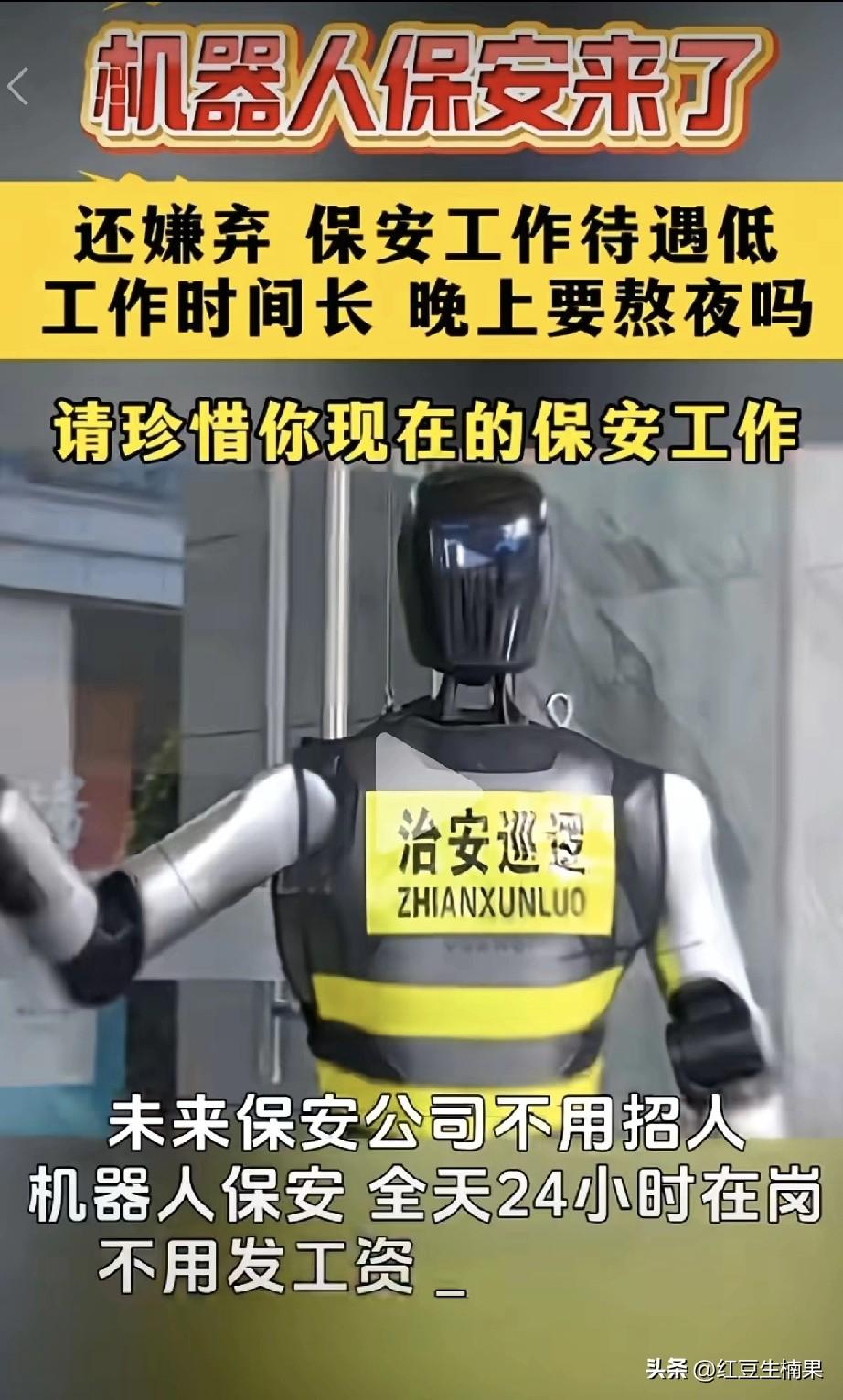这可咋整,原本打算以后年纪大就干保安去,不用操心就开个门,关个门,按时发工资就行。 现在这个梦看来破碎了,因为机器人保安出现了,它只需要充电24小时工作都行,还不用开工资,以后很多企业、商家可能会采用。想到老了舒服点干个保安,上班喝喝茶、看看手机享享福,看来有点够呛了。 所以想干保安的朋友们抓紧窗口期时间,现在就干,不然以后被机器人取代,就没有机会了。